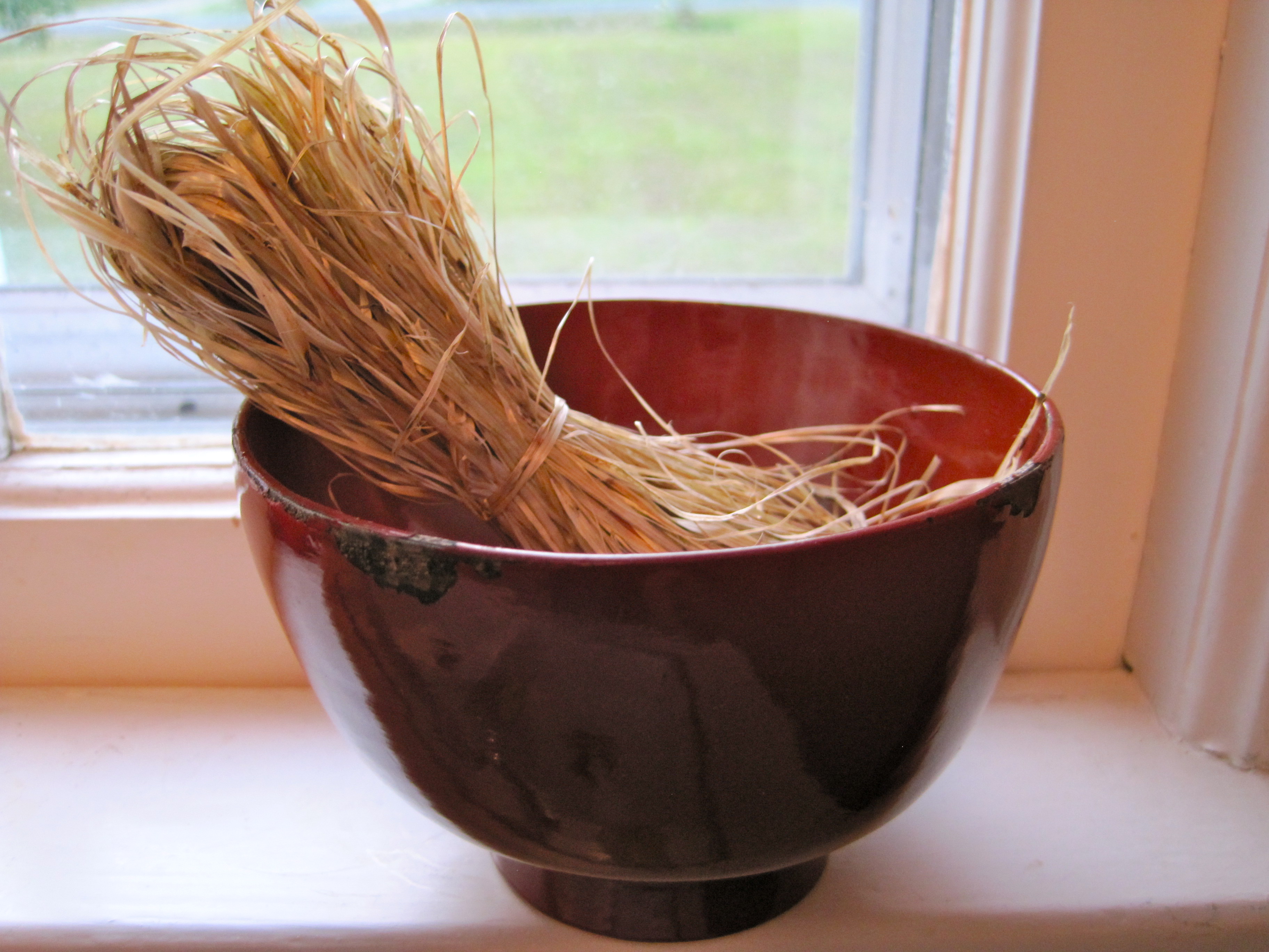 I took this kudzu fiber back in the fall last year. It is a delicate fiber that has a glossy sheen which I think was part of the reason it was such a desirable fiber for clothing of the upper classes in old Japan. I have it resting here in an Edo era lacquer ware bowl. The bowl has a beautiful uneven shape and thick deep red lacquer. I imagine that it was made by a rural lacquer maker as it has a strong rustic handmade feel rather than the delicateness of a more refined city made bowl.