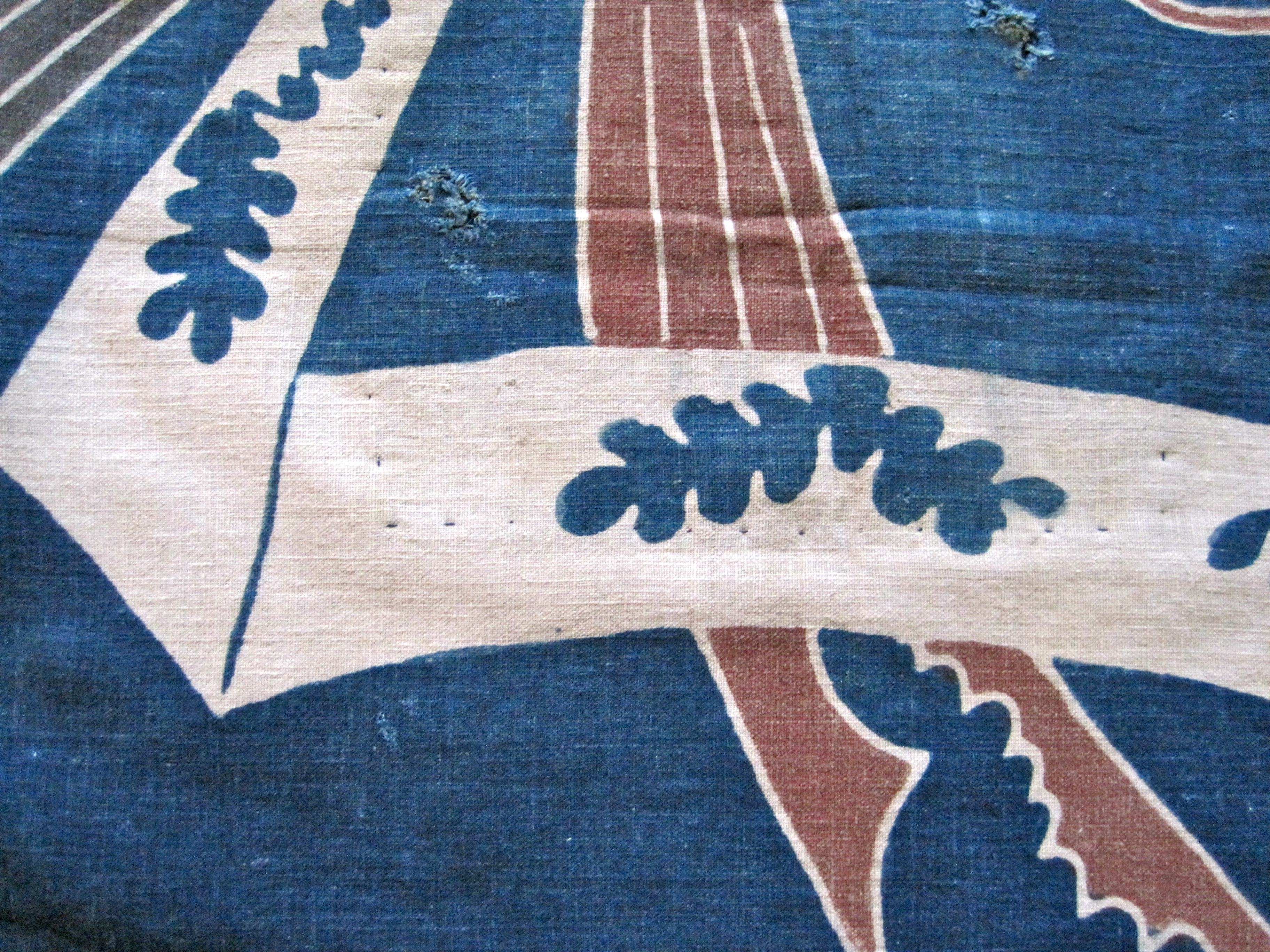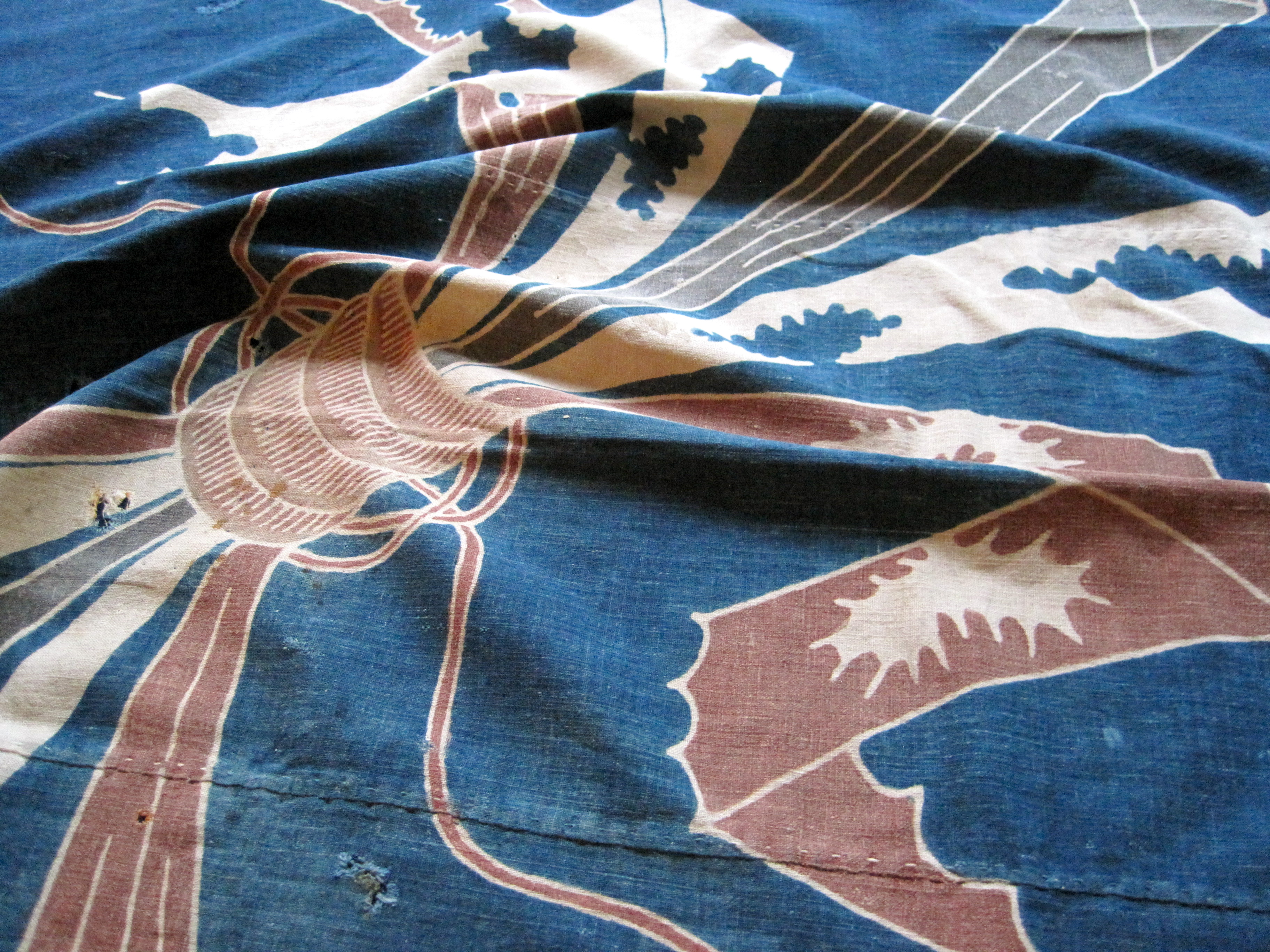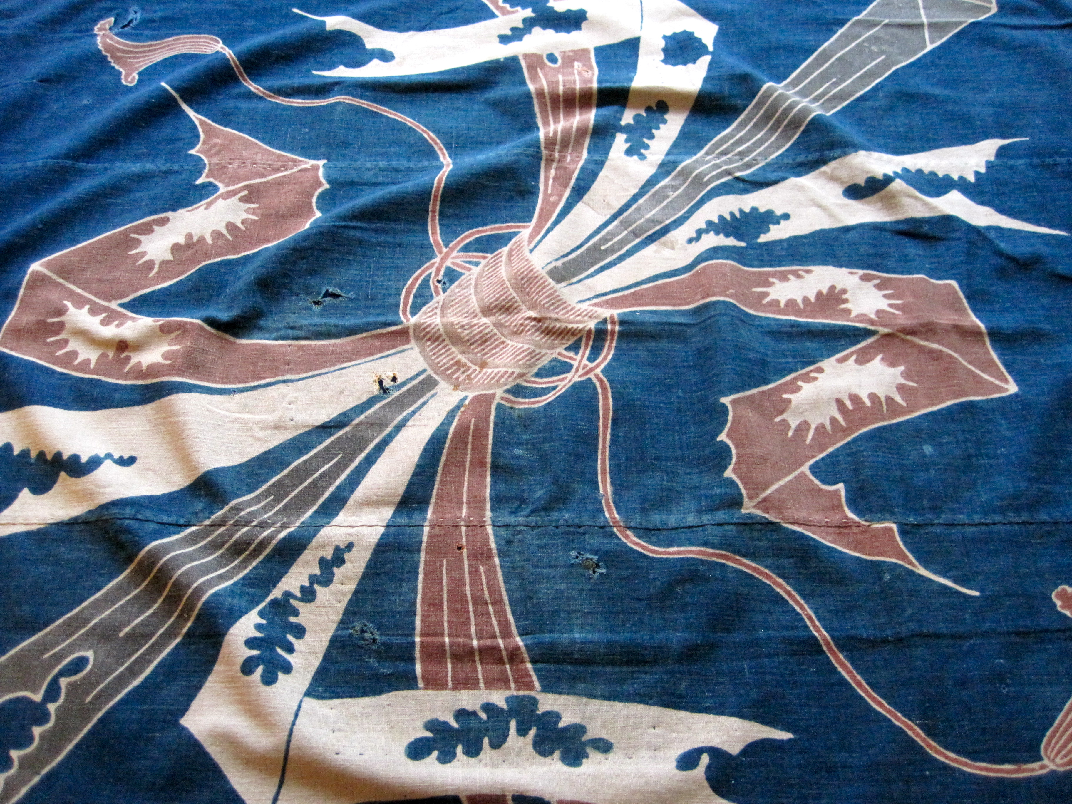 This is a furoshiki, or “carrying cloth” made from three sections of an old Japanese banner. It was produced in the early to mid 20th century. and was dyed using fermented persimmon dye. The kanji was produced using a technique called tsutsugaki. This furoshiki is a great example of the Japanese idea of mottainai or “nothing wasted.” Notice the third section of the furoshiki where the kanji are upside down.