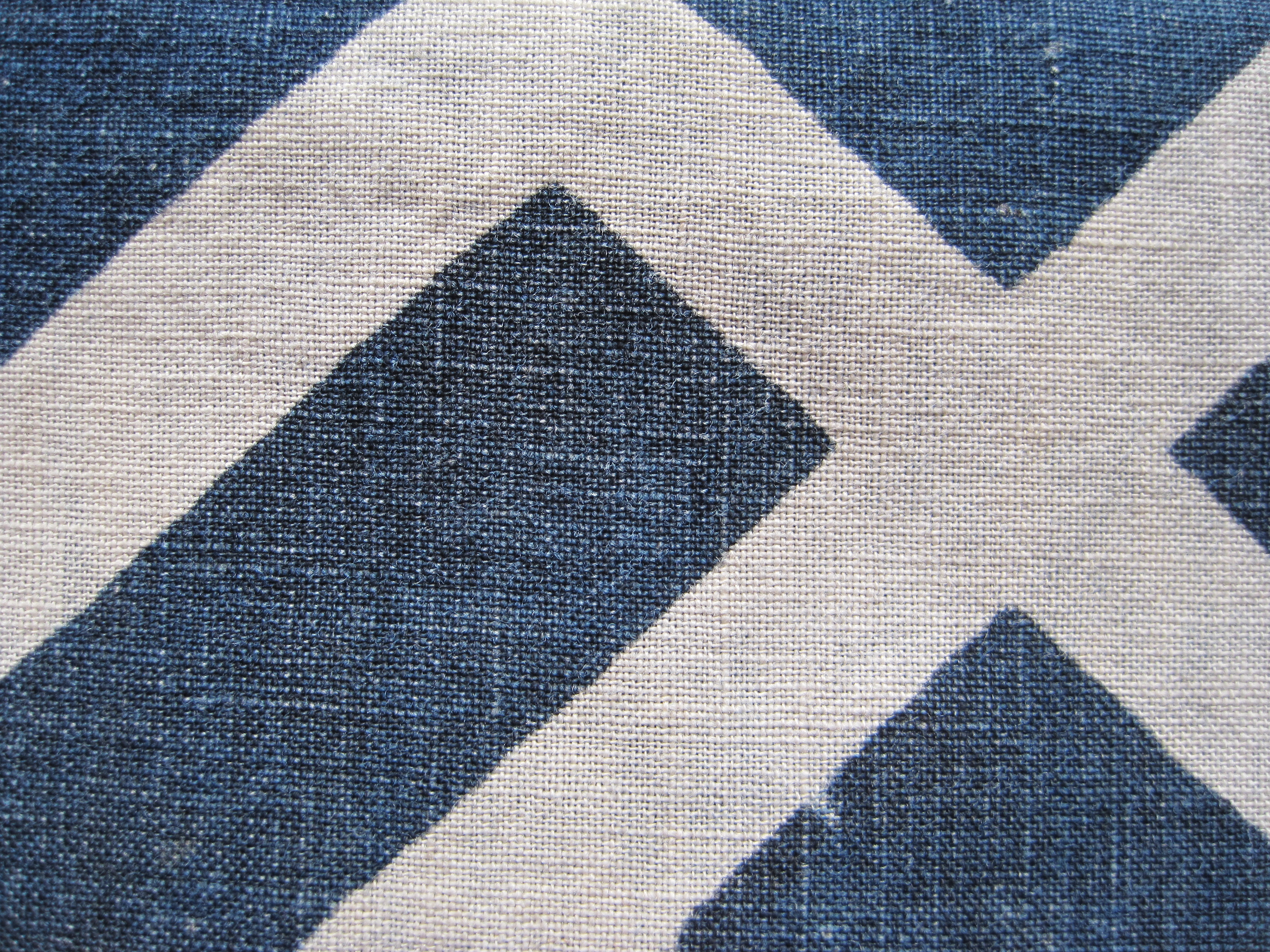 I recently found this very worn zanshi fabric. The warp is hemp and the weft is cotton and hemp. It has a beautiful worn feel simular to antique linen. It has been dyed with indigo, but the natural color variations in the hemp thread also lend to the design. Zanshiori is fabric that has been woven using the threads left over at the ends of numerous bobbins. due to the use of thread fragments the fabric has a random pattern and a varied texture because of the knots used to bind all the threads in the weft together. Zanshi was often woven at the end of a bolt of fabric to make use of any remaining warp.