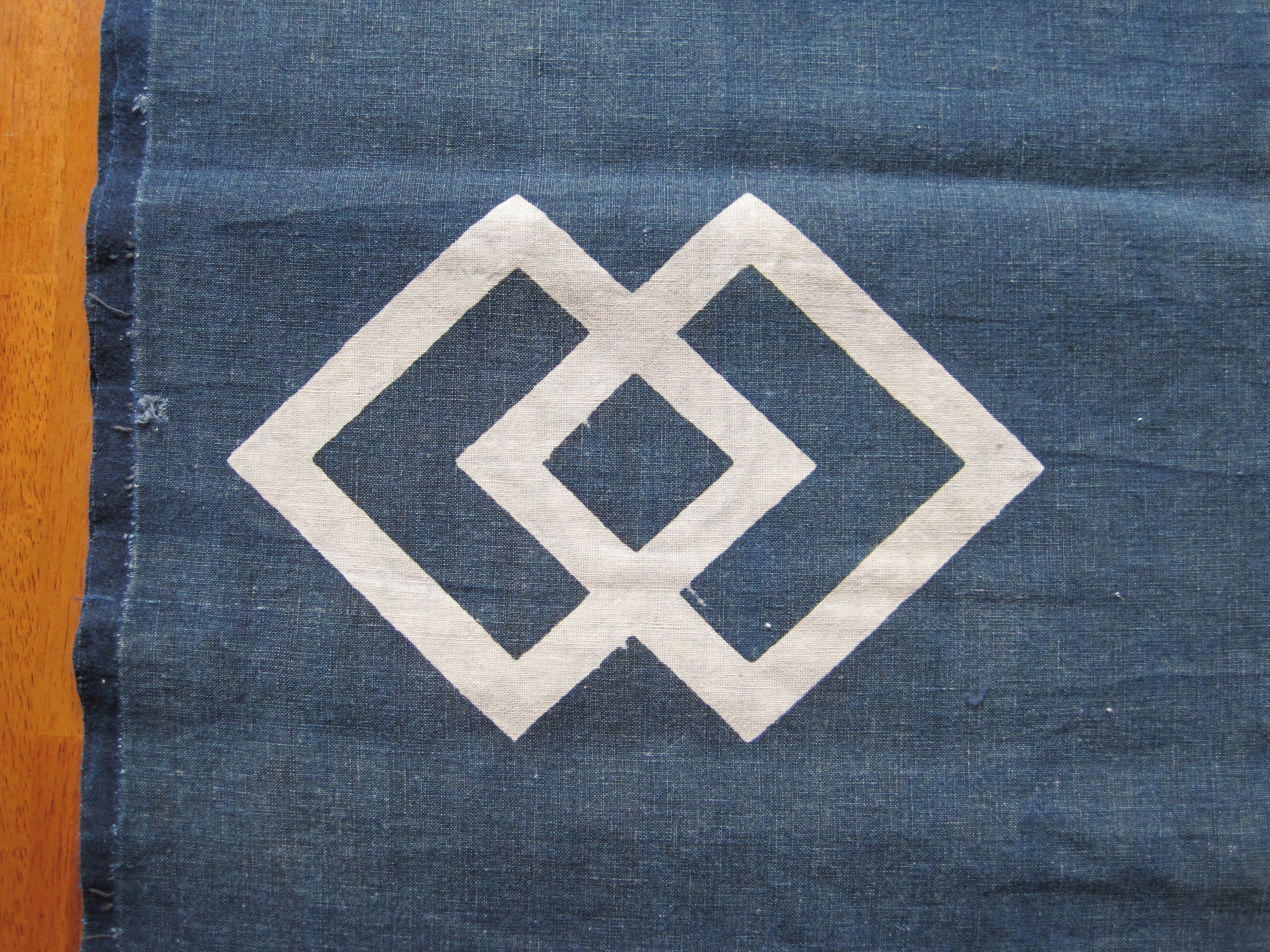 This Meiji era furoshiki or “carrying cloth” was probably once the smallest of a set of three furoshiki that were part of a brides trousseau. The central kamon or “crest” and the kanji on the side have been dyed using a technique known as tsutsugaki. I love the simple design and the naive way the kamon and kanji are rendered. What makes this piece so nice are the beautiful patches and stitches that adorn the back and peek through to the front.