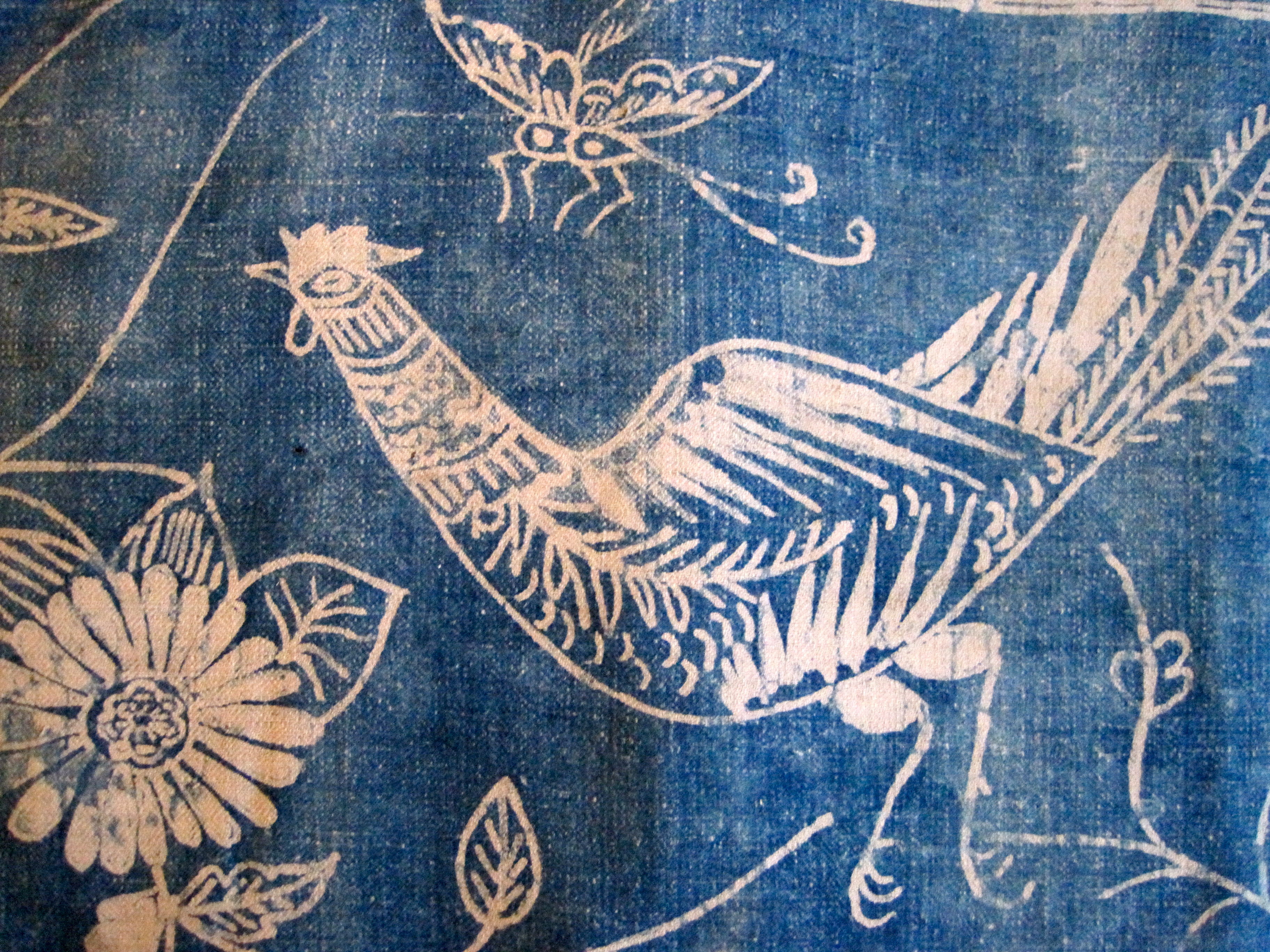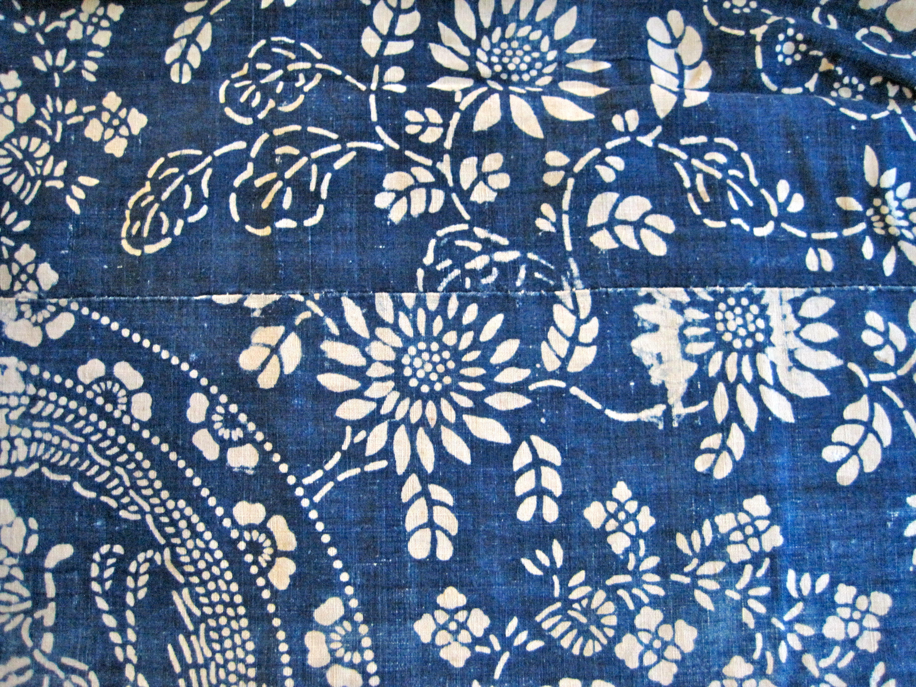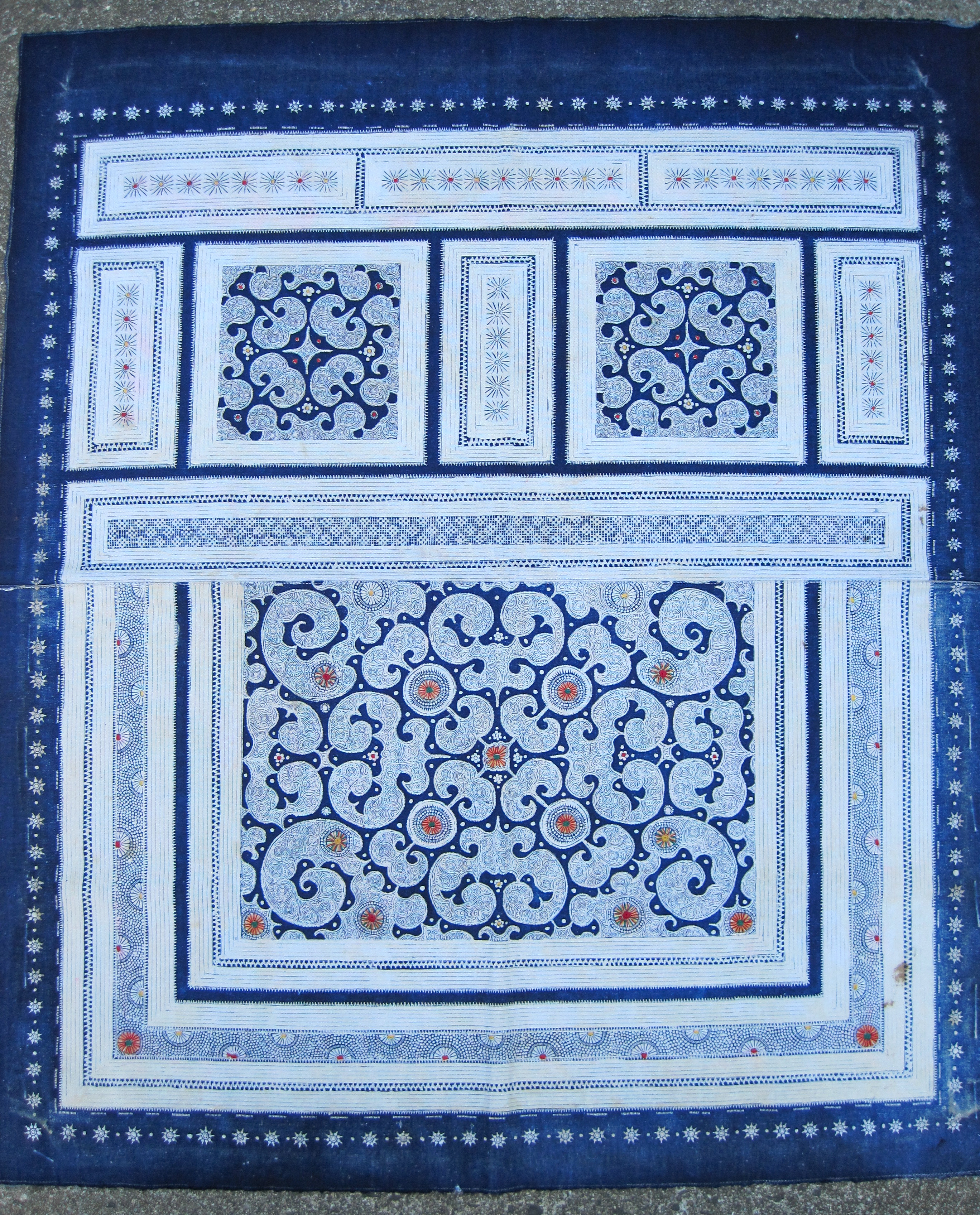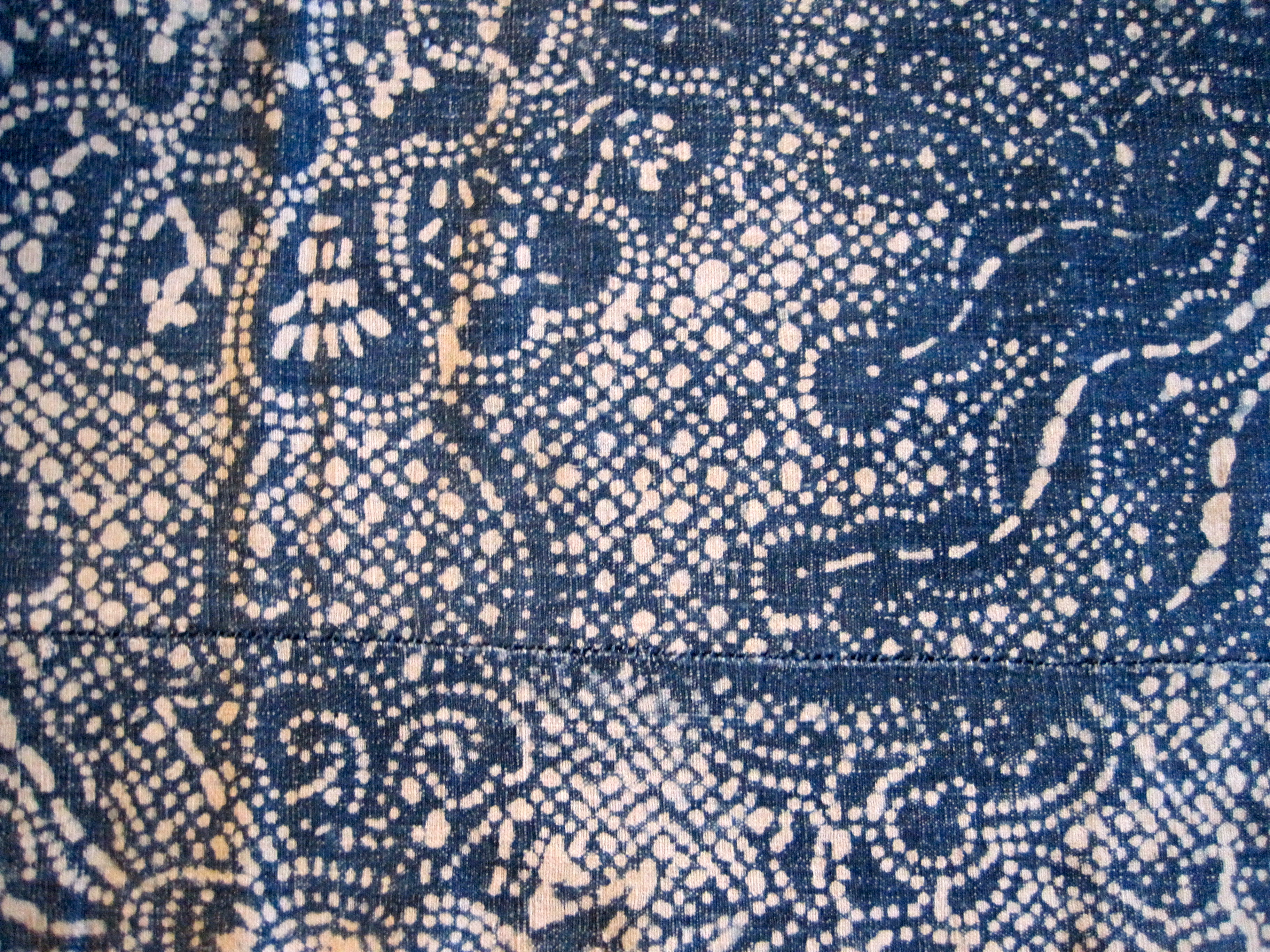 This is a panel from a Miao baby sling. The Miao live in southern China and represent a distinct ethnic minority in China. I purchased several of these fabrics while traveling in China a few years ago and I think this one is about 80 or 90 years old. The machine produced cotton has been dyed with natural indigo and the design was created using a resist process that employed a wax taken from the sweet gum tree. The process of this batik style has been extensively documented by Sadae and Tomoko Torimaru in their book Imprints On Cloth. They say this intricate form of batik comes from the North Western part of Guizhou province.