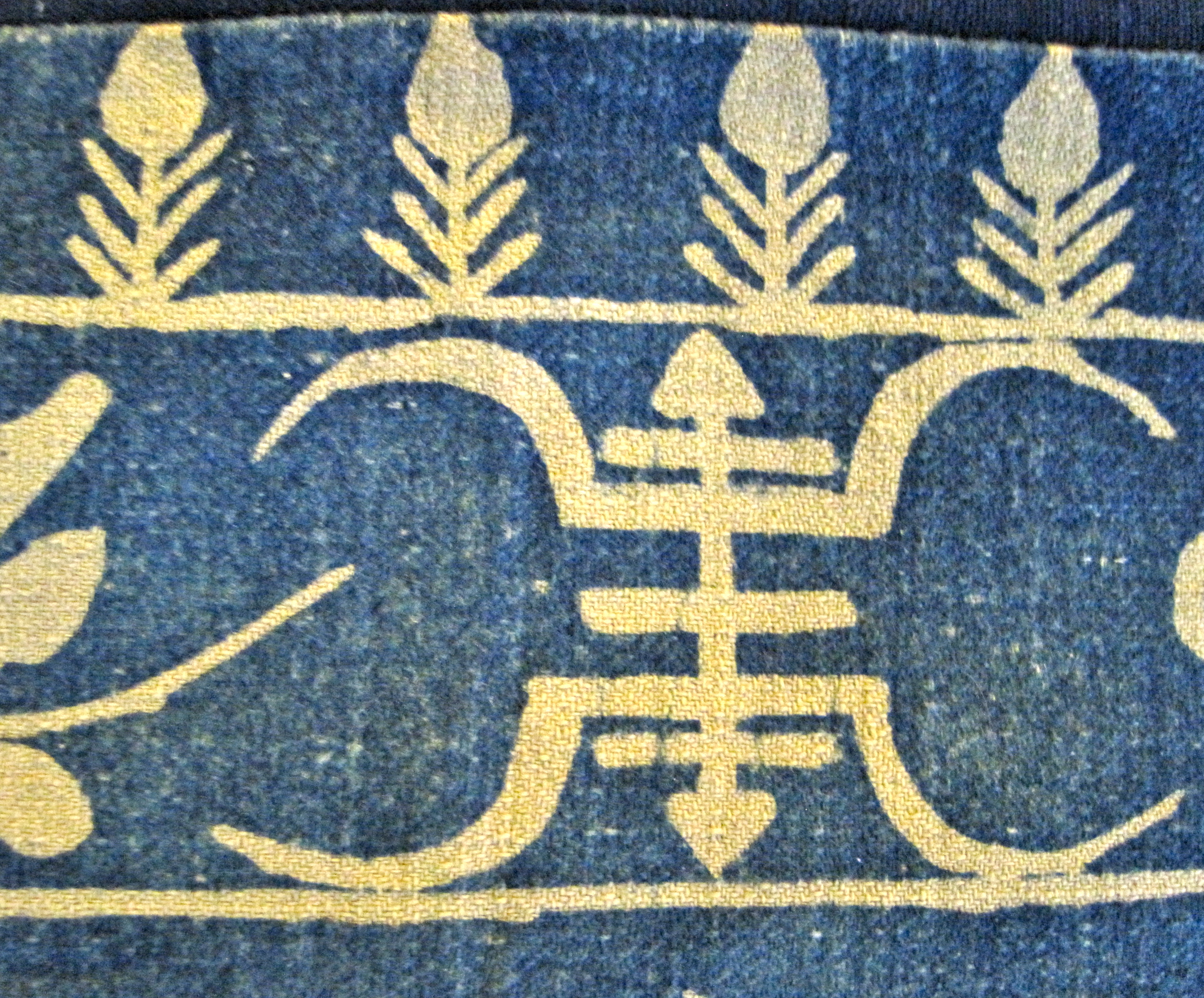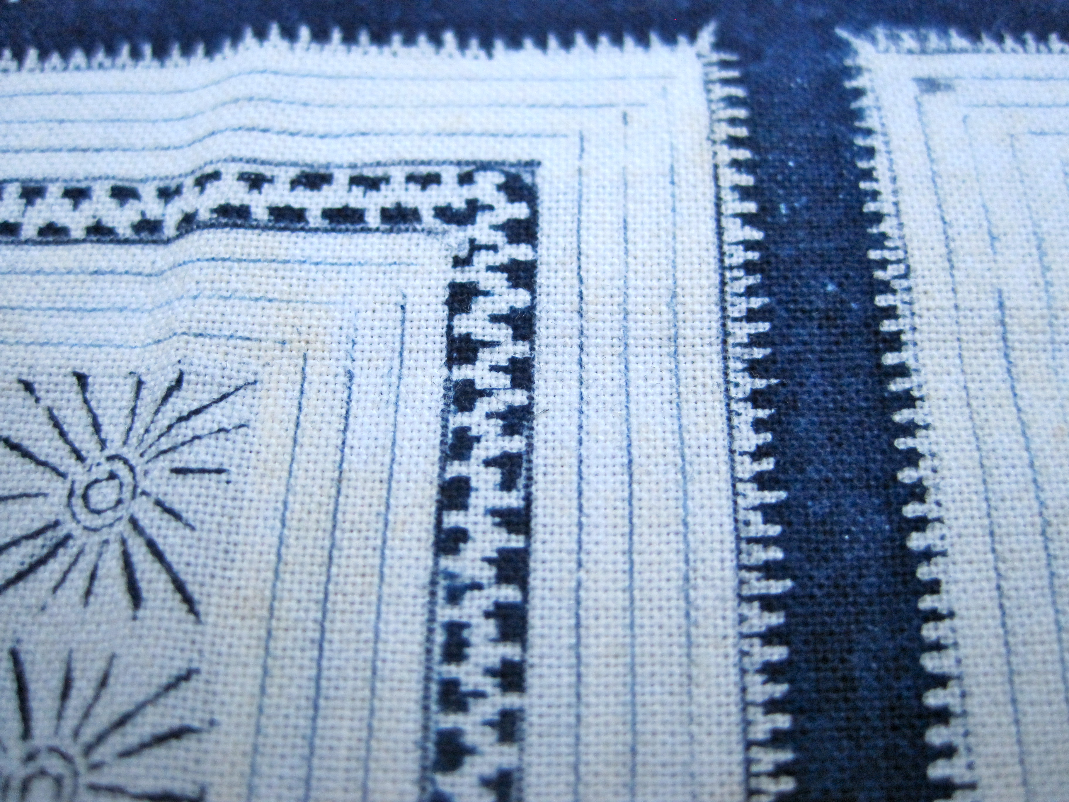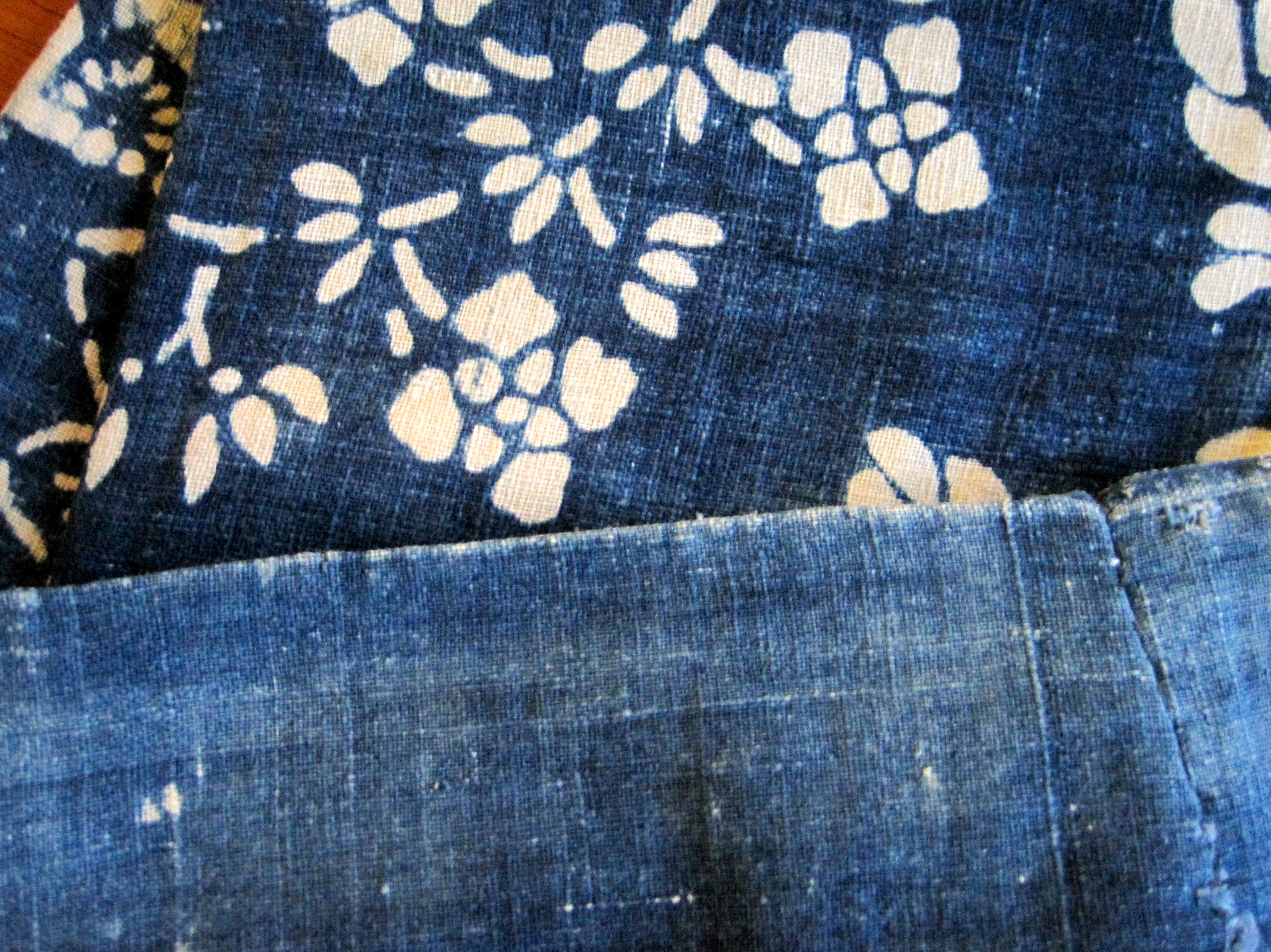 This is a panel from a Miao baby sling. The Miao live in southern China and represent a distinct ethnic minority in China. I purchased several of these fabrics while traveling in China a few years ago and I think this one is about 80 or 90 years old. The machine produced cotton has been dyed with natural indigo and the design was created using a resist process that employed a wax taken from the sweet gum tree. The process of this batik style has been extensively documented by Sadae and Tomoko Torimaru in their book Imprints On Cloth. They say this intricate form of batik comes from the North Western part of Guizhou province.