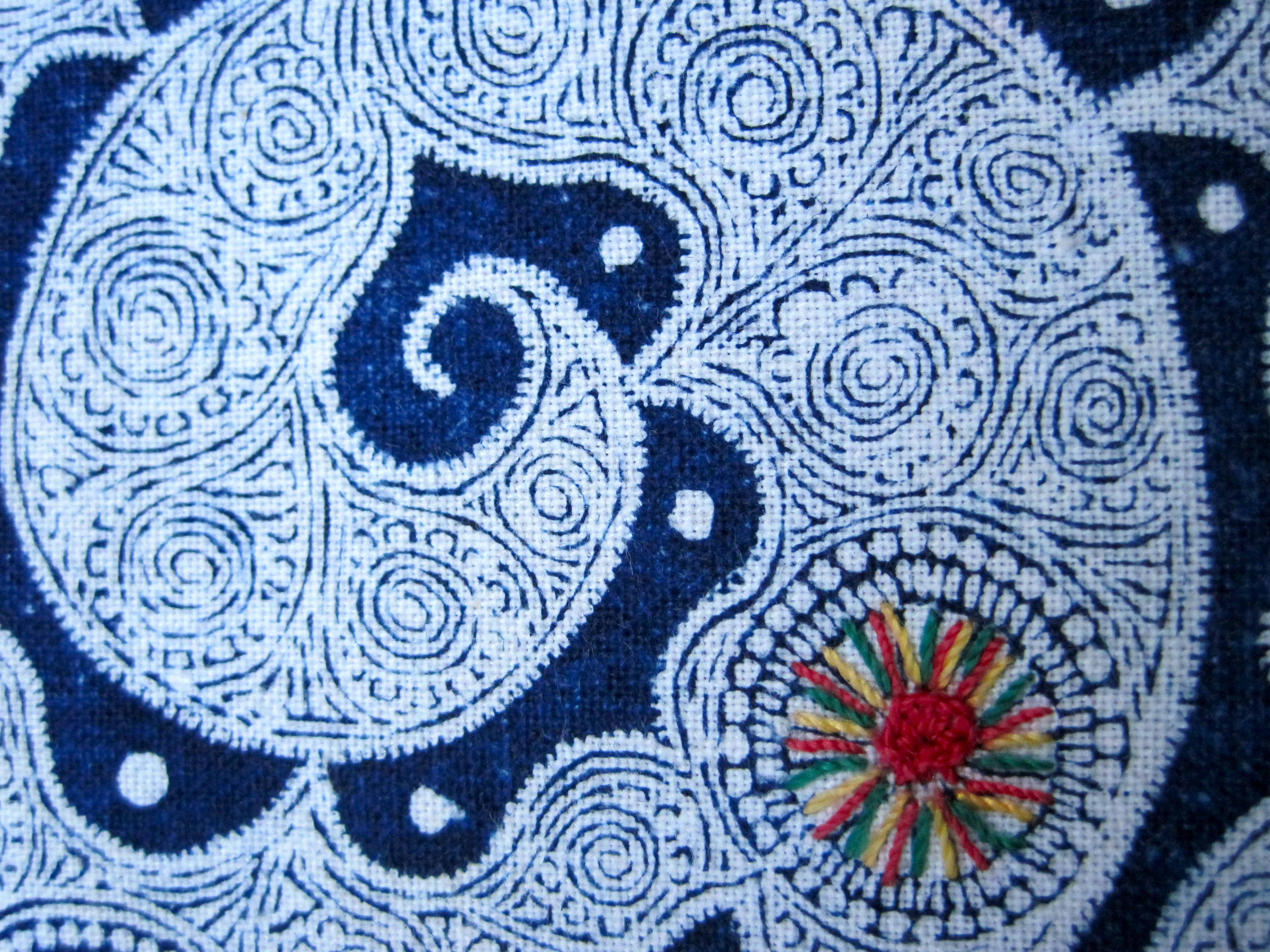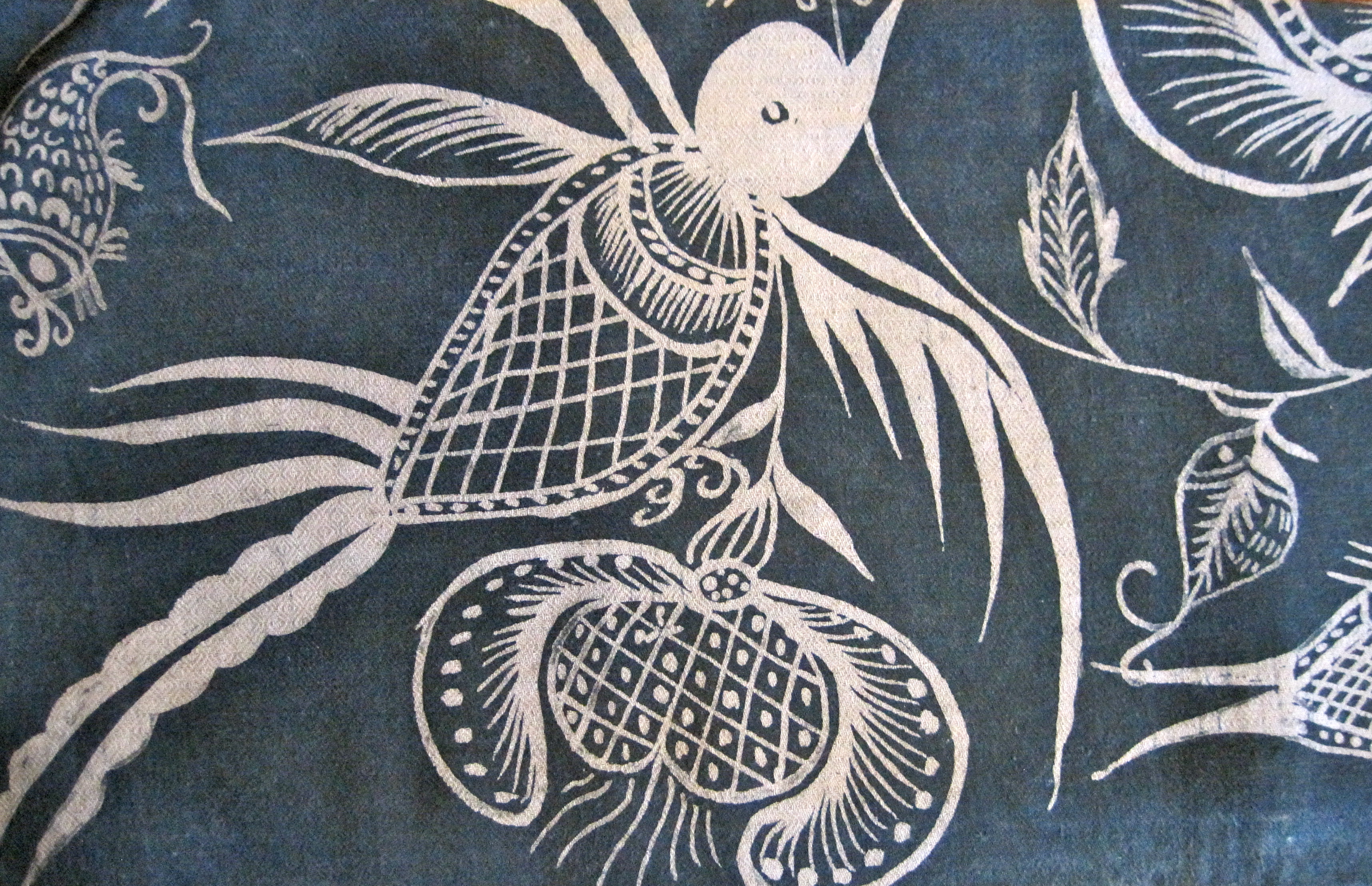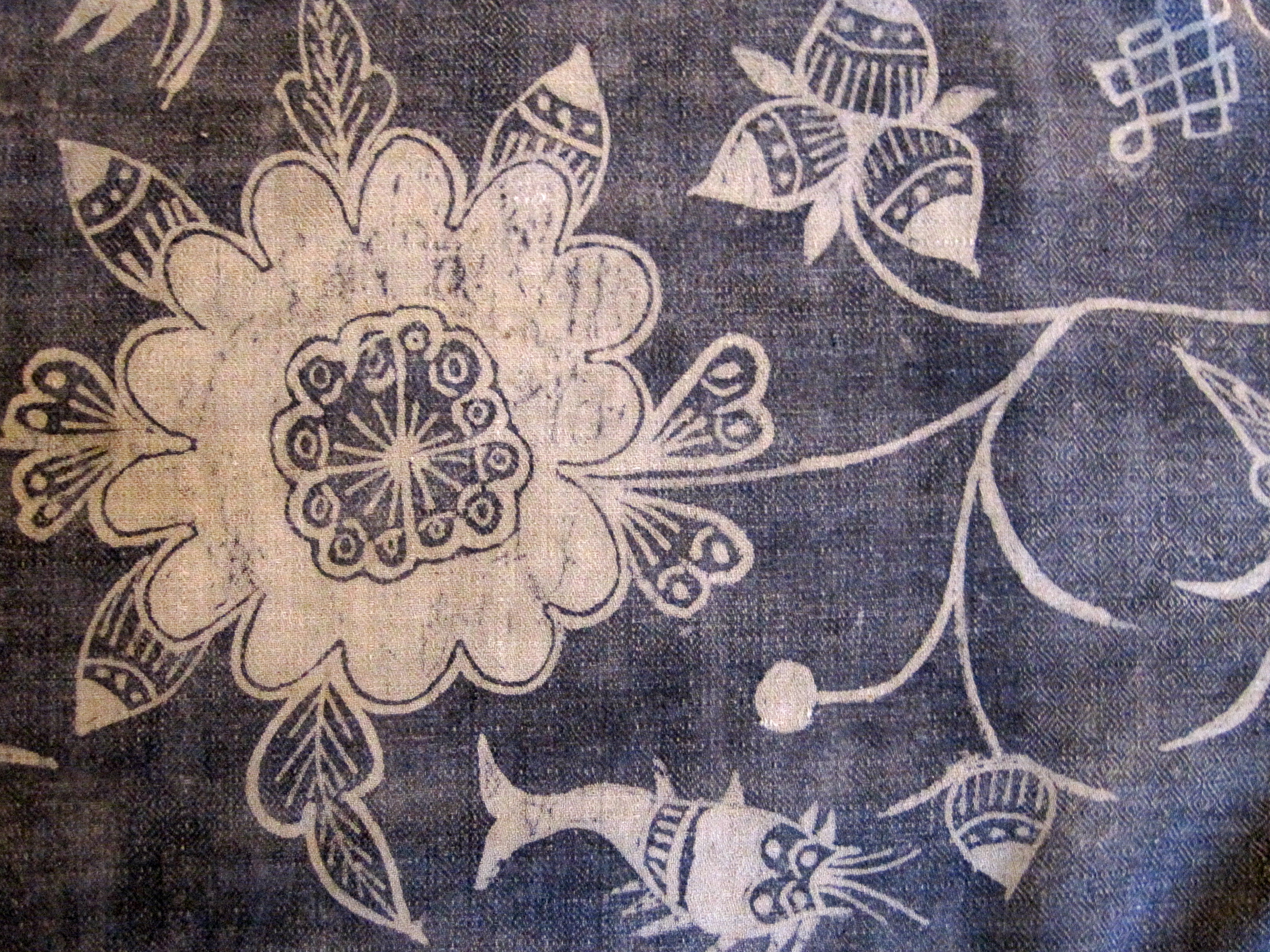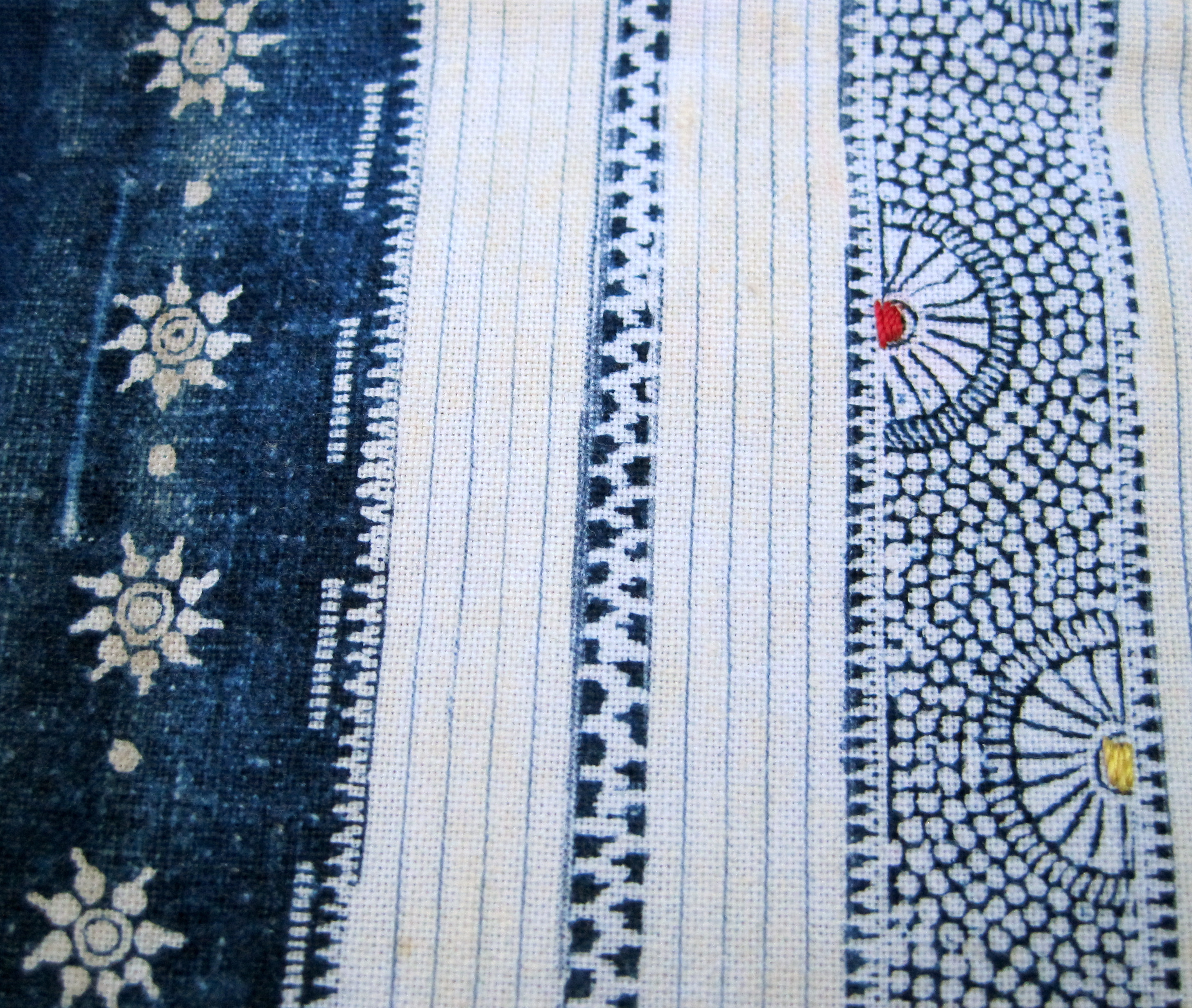 This is a panel from a Miao baby sling. The Miao live in southern China and represent a distinct ethnic minority in China. I purchased several of these fabrics while traveling in China a few years ago and I think this one is about 80 or 90 years old. The machine produced cotton has been dyed with natural indigo and the design was created using a resist process that employed a wax taken from the sweet gum tree. The process of this batik style has been extensively documented by Sadae and Tomoko Torimaru in their book Imprints On Cloth. They say this intricate form of batik comes from the North Western part of Guizhou province.