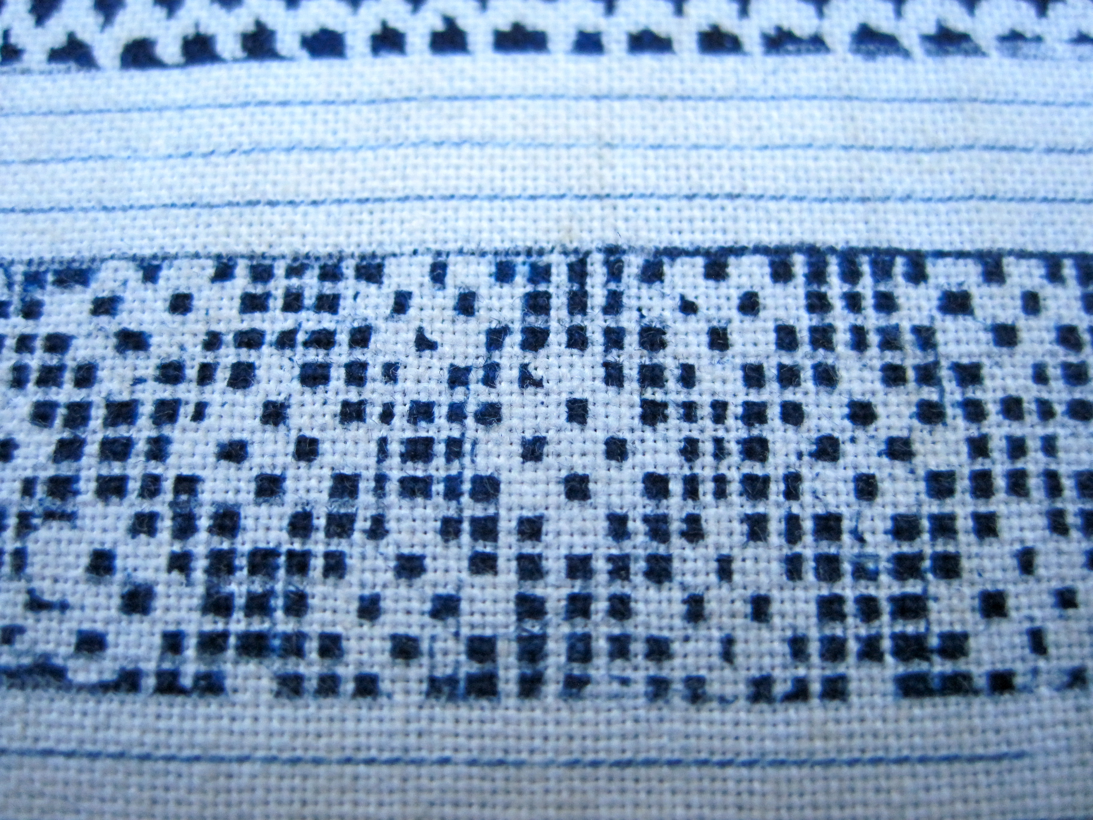 These images come from six antique Miao blankets. all of the blankets are cotton and they have all been dyed using indigo. Freehand drawing and stencil methods of resist dying have been employed to create the designs on these blankets. two different weaving patterns have been used to create the cotton base fabrics. The two older blankets are woven with a plain weave and the four remaining have a diamond pattern that is traditional to the Miao of Guizhou provience, China.