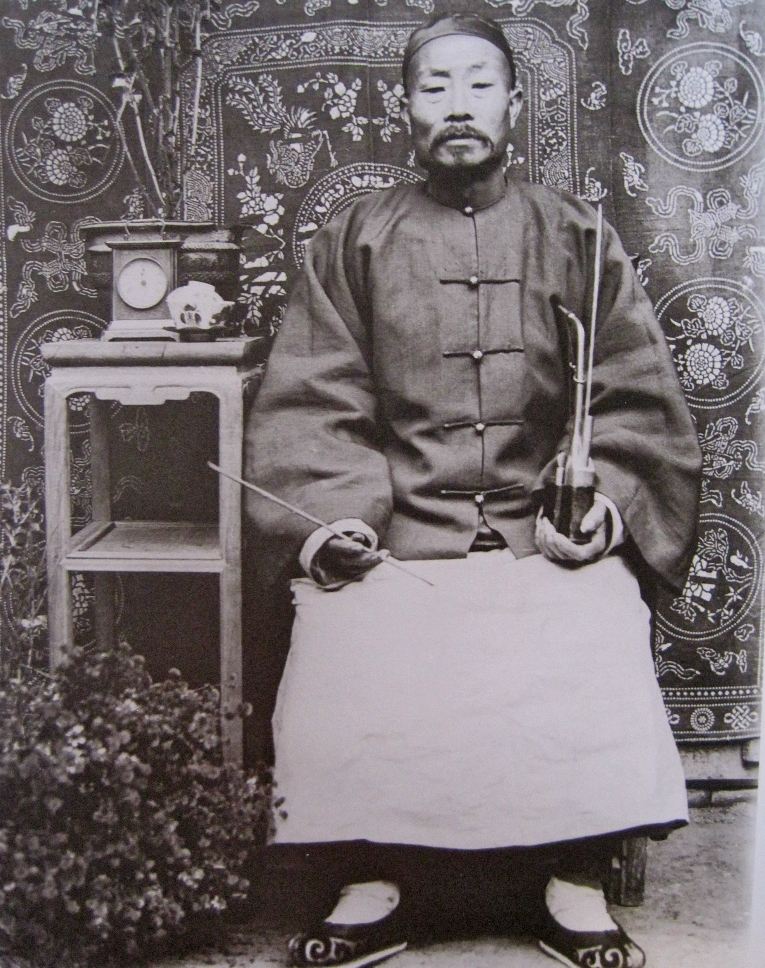 This photo comes from a book titled Lost China. The blanket hanging behind the man in the photo is simular in construction, narrow strips of fabric, and in the use of stencil resist designs to the older blankets shown above.