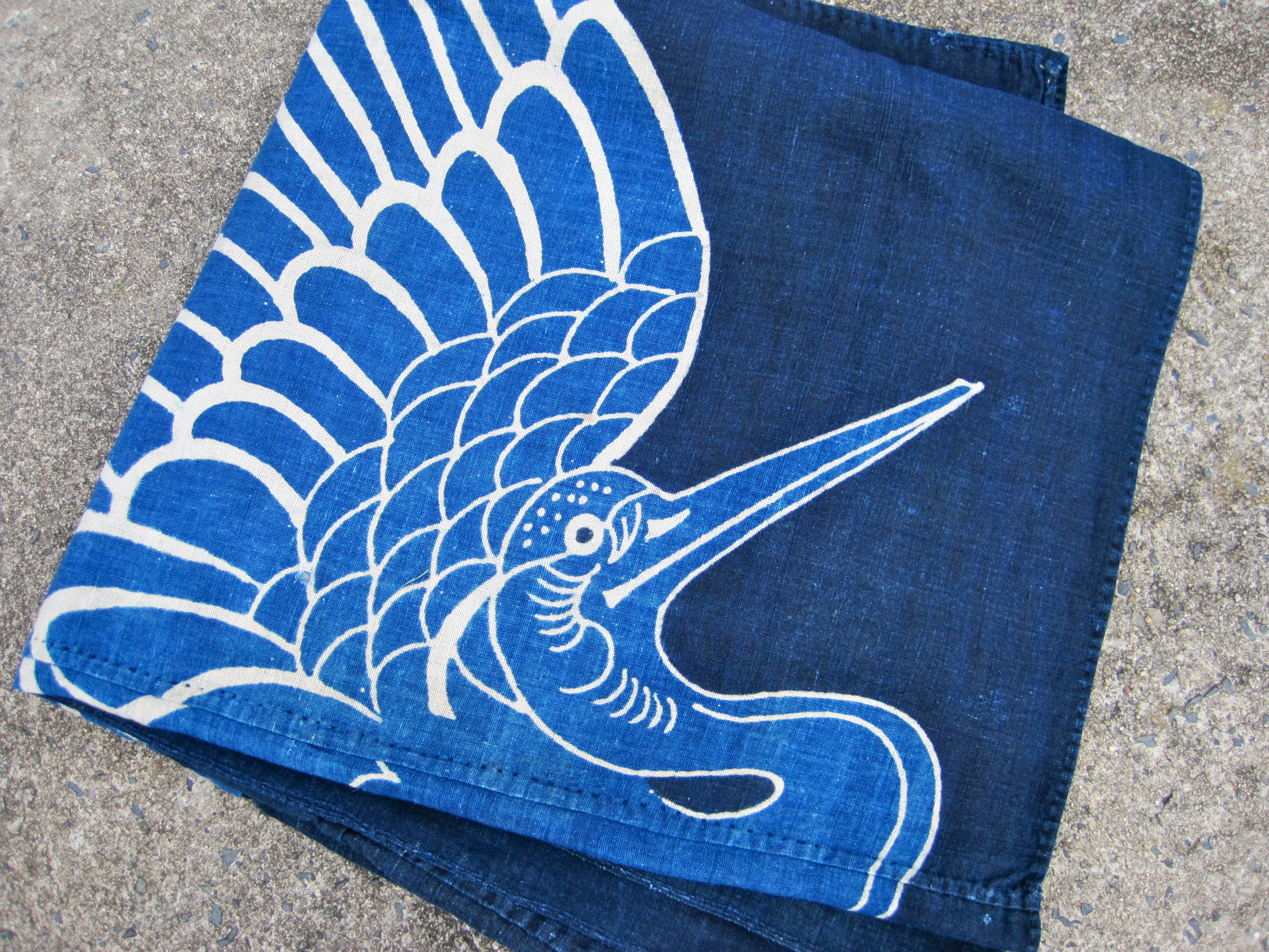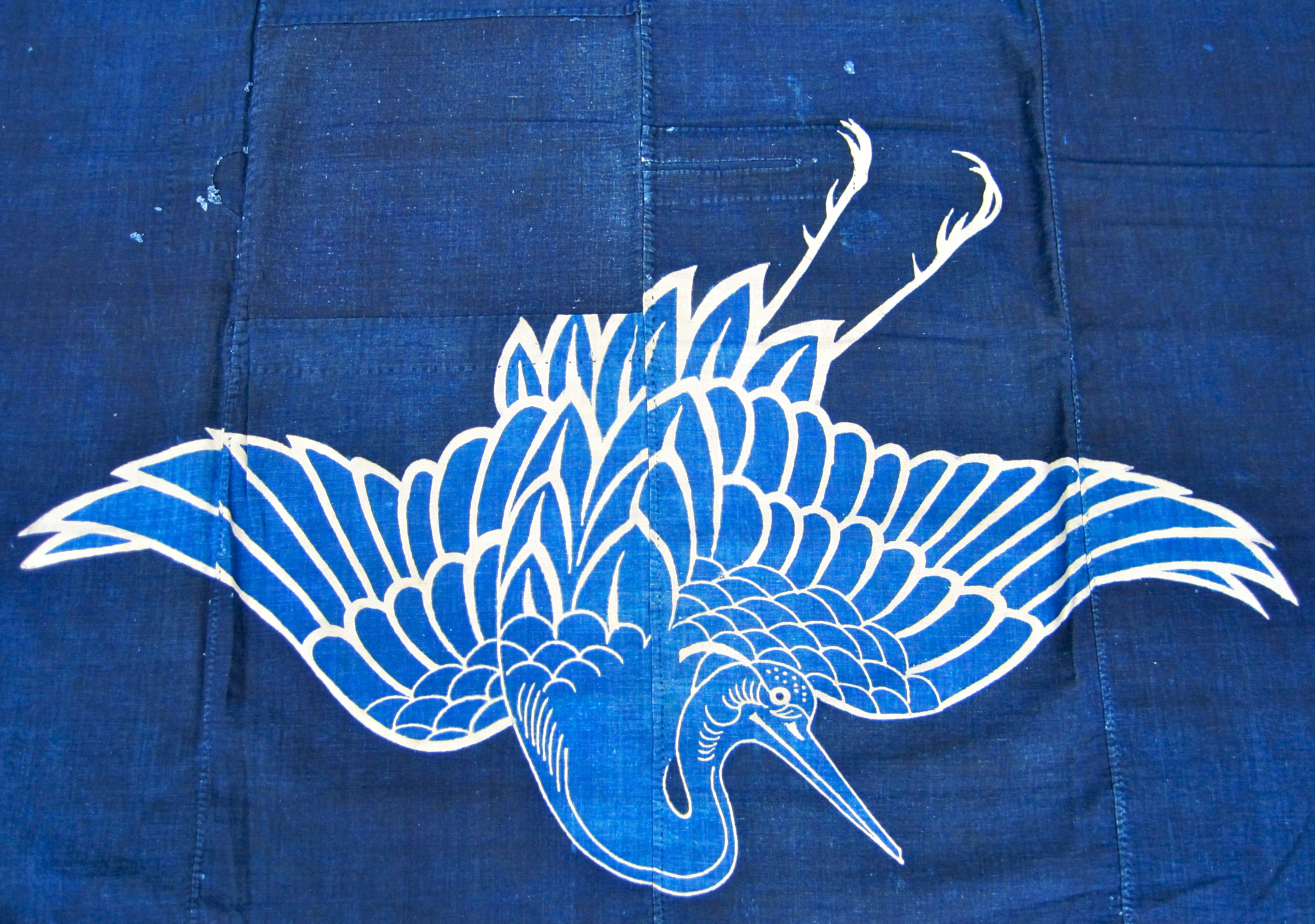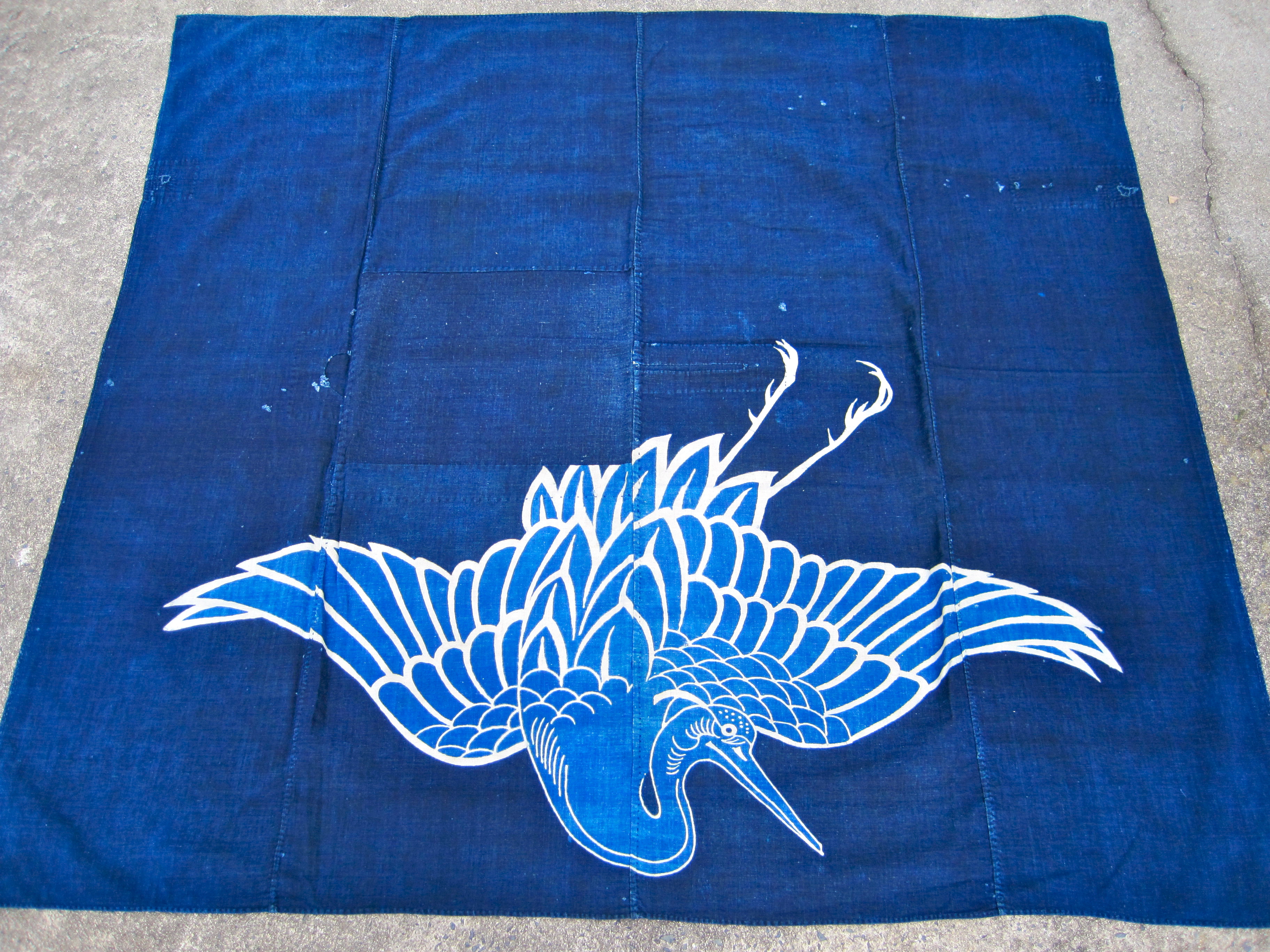 This furoshiki or “carrying cloth” dates to the Meiji period and was made from hand spun and hand woven cotton fabric. The crane was expertly dyed using natural indigo. This type of decoration is known as tsutsugaki it was created by a dyer who used a paper cone or “tsutsu”. The tsutsu was used to apply a mixture of ground rice bran, rice flour, salt, and water onto the fabric to create a resist. This resist was washed away after dying to reveal the design. It must have taken several applications of rice paste and many dips in the indigo dye bath to create the colors in this furoshiki.