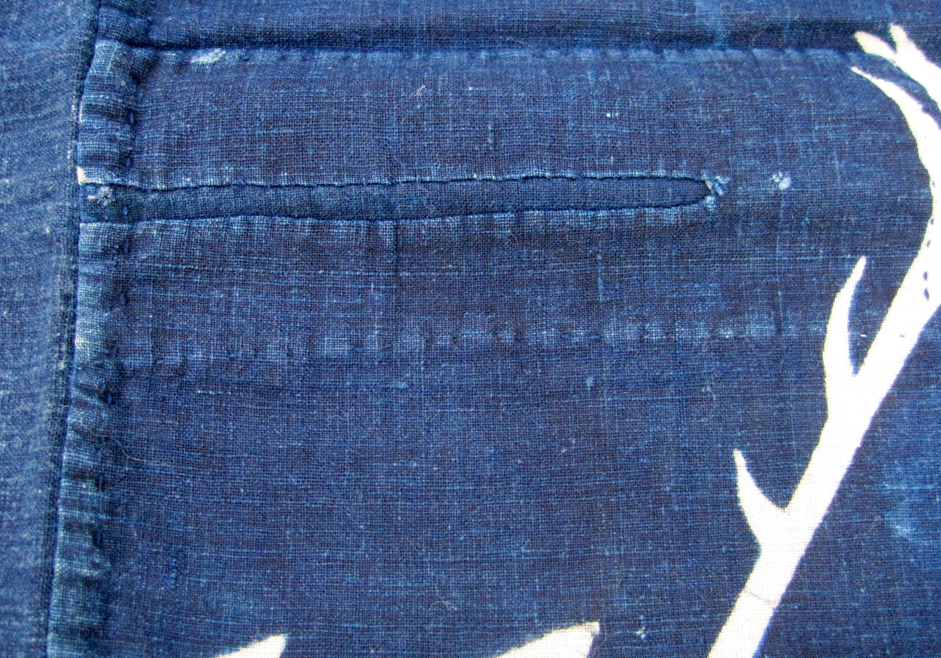 Sashiko is a form of traditional Japanese embroidery originally used to reinforce garments and as a means of repair. In the northern regions of Japan garments were made stronger and warmer by layering cloth and stitching the layers together with long running stitches. This embroidery served a utilitarian purpose but also became a way to add decorative patterns and interest to garments and carrying cloths.