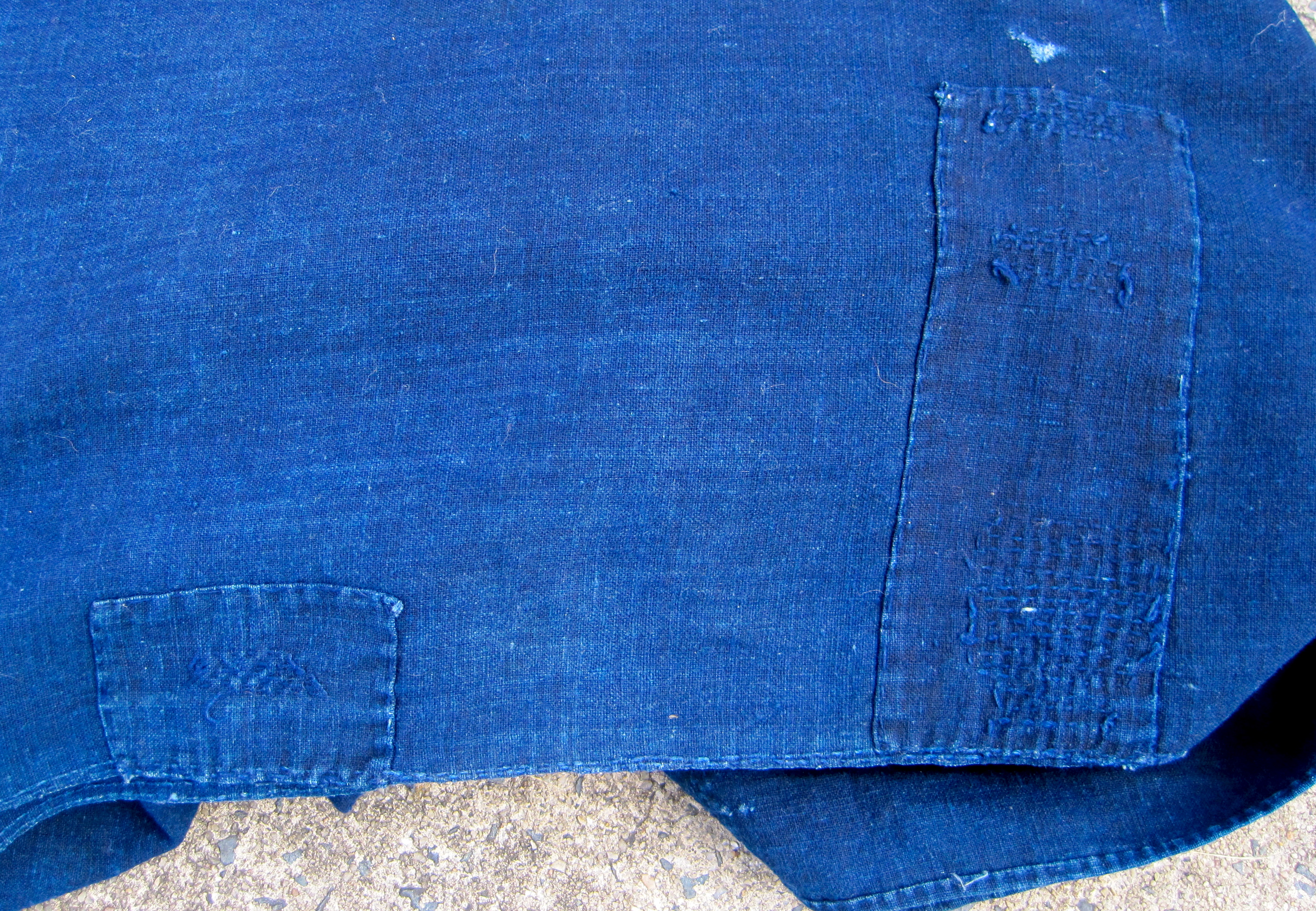 This furoshiki may have started its life as a futonji or “padded futon cover”. The symbolism of the crane was one often used on items made to be given to a bride and groom as a wedding gift. It has several large repairs that attest its use over the years. The repairs have all been mended using hand spun and hand woven cotton. The large patch in the middle of the furoshiki is made of very thick course homespun.