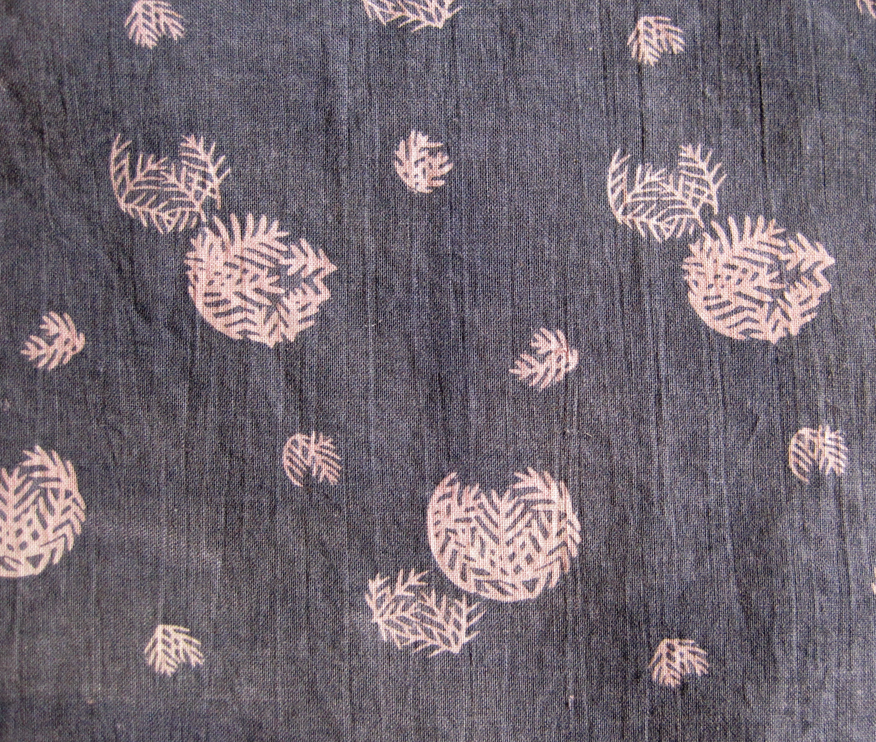 This small two panel furoshiki was probably part of a set of three or four and has been decorated with a family crest indicating it may be part of a traditional wedding dowry. It dates to the late 19th century and is made of hand spun and hand woven cotton. The color is a worn grey which I think may have been obtained by using sumi ink as a dye. The small tsutsugaki pine tree design in the corner is wonderfully simple and sweet.