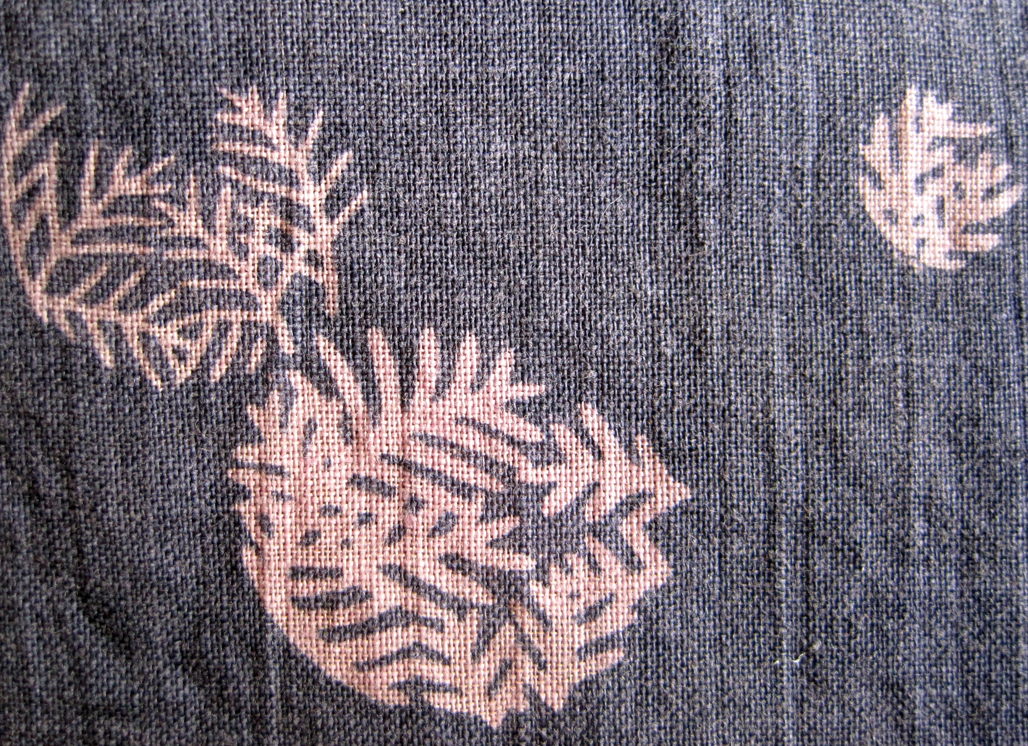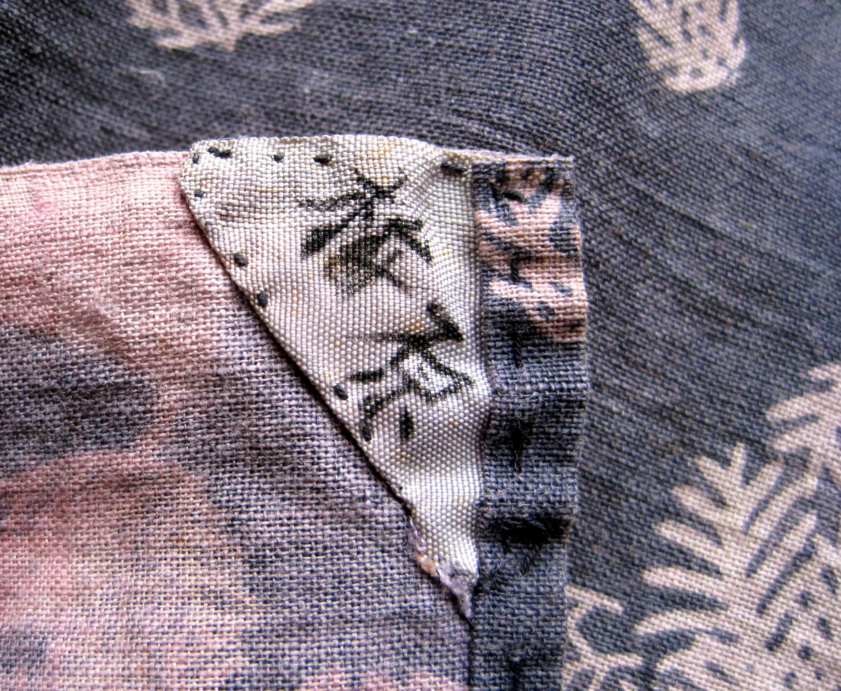 This small kimono for a baby was made out of old material called boro or “rags” pieced together to make usable fabric. The boro material was intended to be the liner but, I have decided to show it off as the shell. the boro material probably came from an indigo dyed tsutsugaki furoshiki or “free hand resist dyed carrying cloth”. These were traditionally given in sets to a new bride and groom and were often dyed with the families mon or “crest”. I love the idea that the newlyweds used it until it became tattered and then remade it into clothing for one of their children. The outer fabric shown below as the liner has a design of small dogs. This fabric was factory made and was meant to replicate a double kasuri or “ikat” material. This fabric shows patches that do not make their way through to the lining material meaning that this material had been used and repaired at the time that it was made into this garment. More than likely it was also a hand me down.