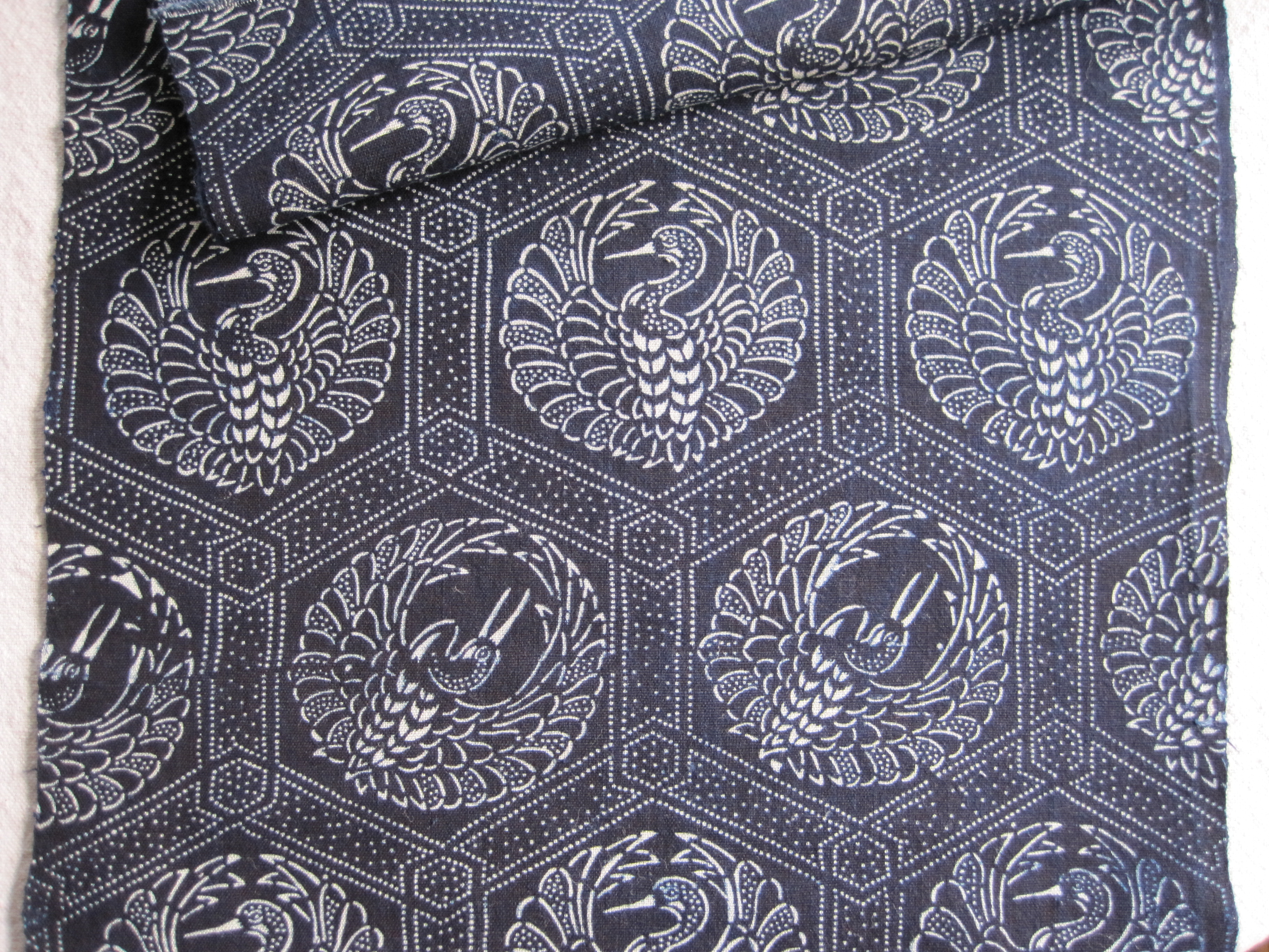 both of the fabrics shown here has been pattered using a katagami, or paper stencil used to apply rice paste to the fabric as a resist before dying. These stencil dyed fabrics are known as katazome.