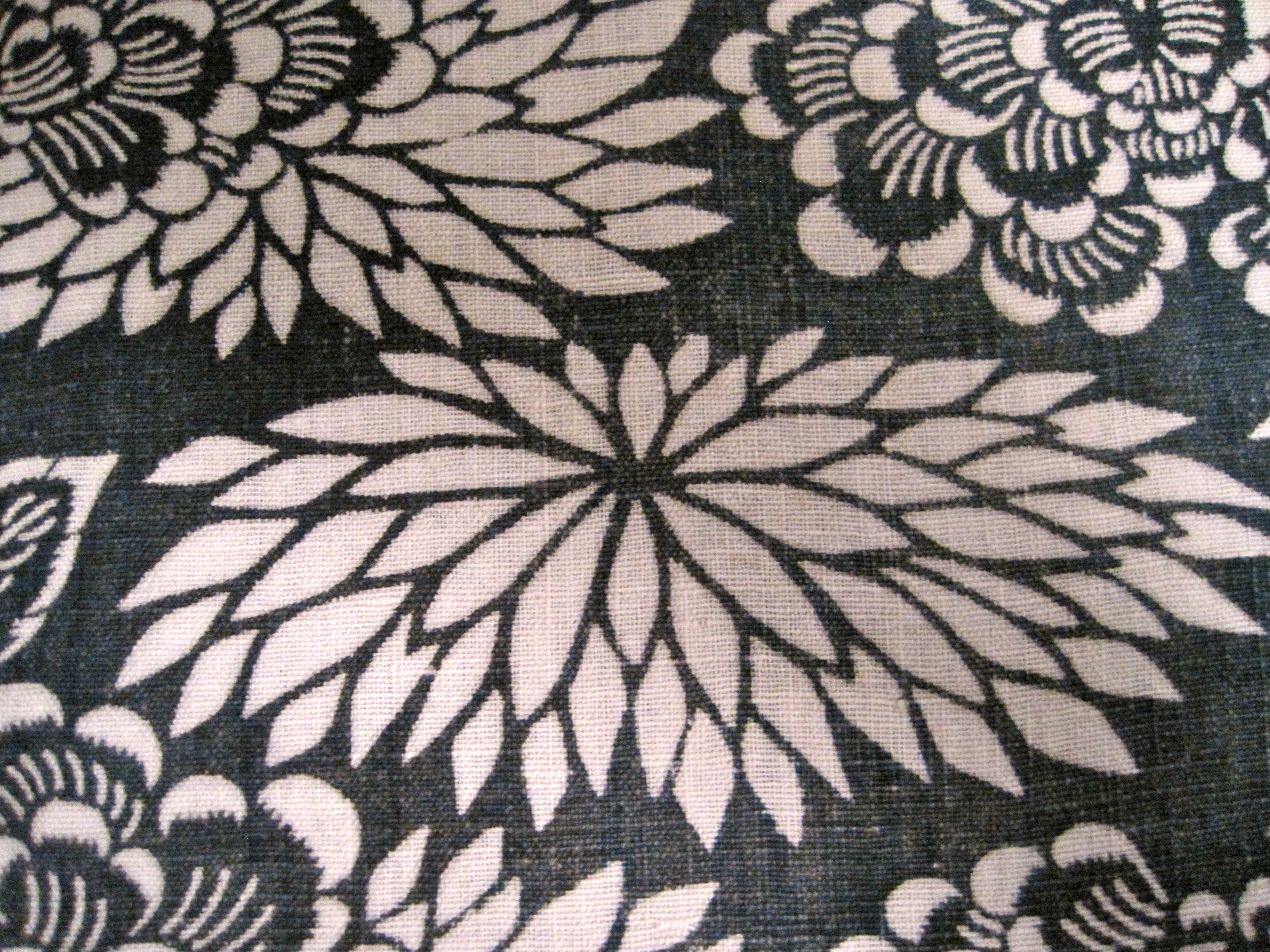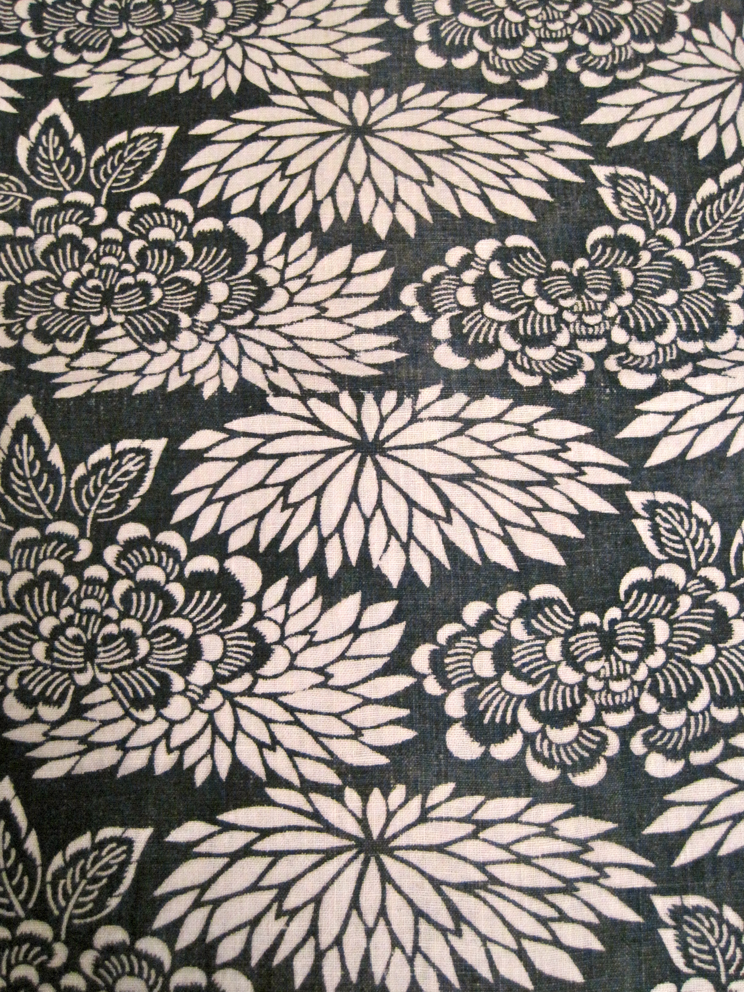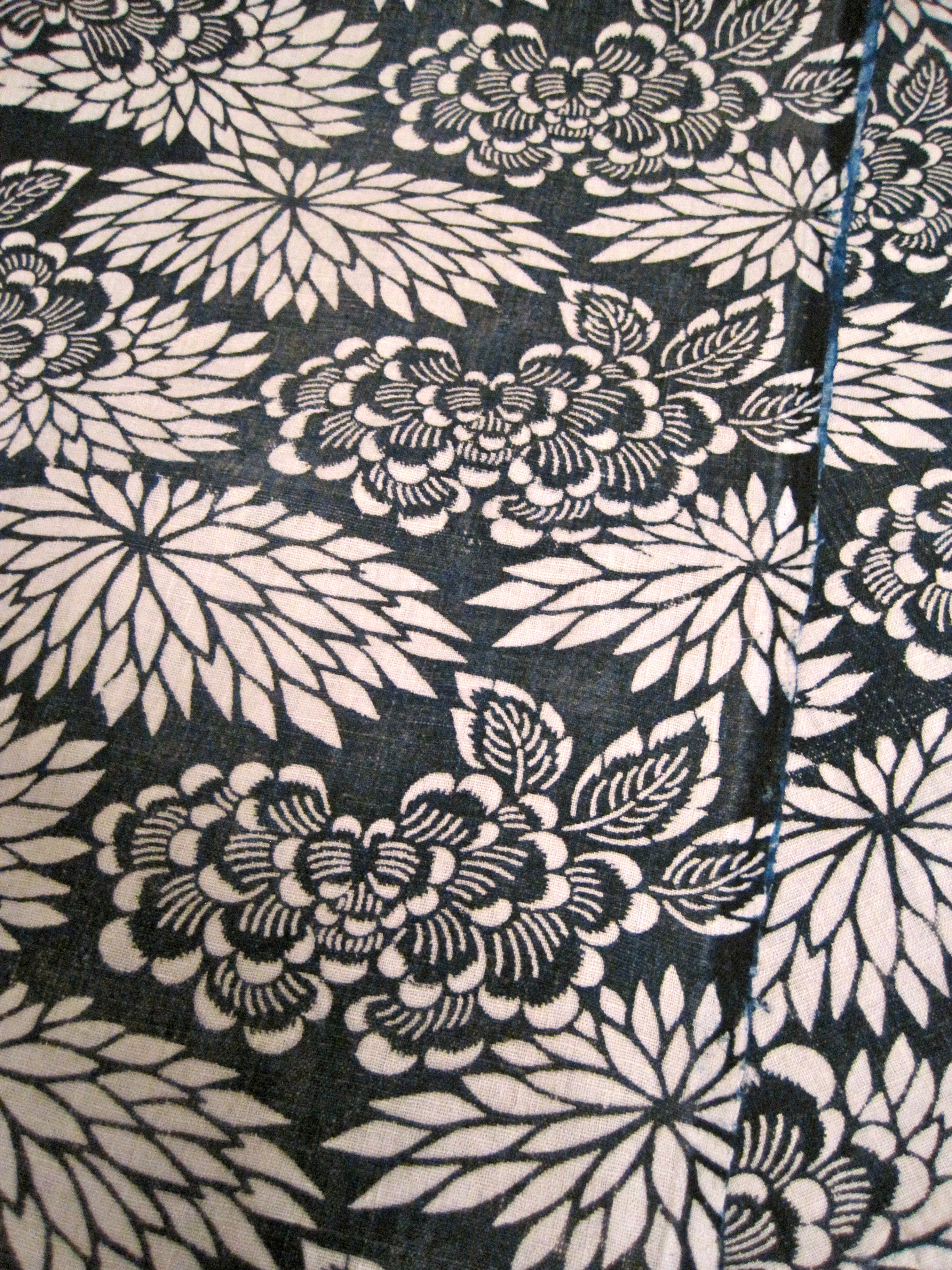 I like this early Meiji katazome for its bold design of chrysanthemum flowers and its beautiful hand spun texture. I also think its really amazing how strong the indigo remains after over 120 years. This design tells a lot about how katazome designs were created. You can clearly see the small connecting lines in the design that were made by small pieces of the original paper stencil. These small connecting lines helped hold the stencil together when an artisan was pushing rice paste through the stencil to deposit the resist. This second photo also shows the spot where the stencil was overlapped to create one continuous design.