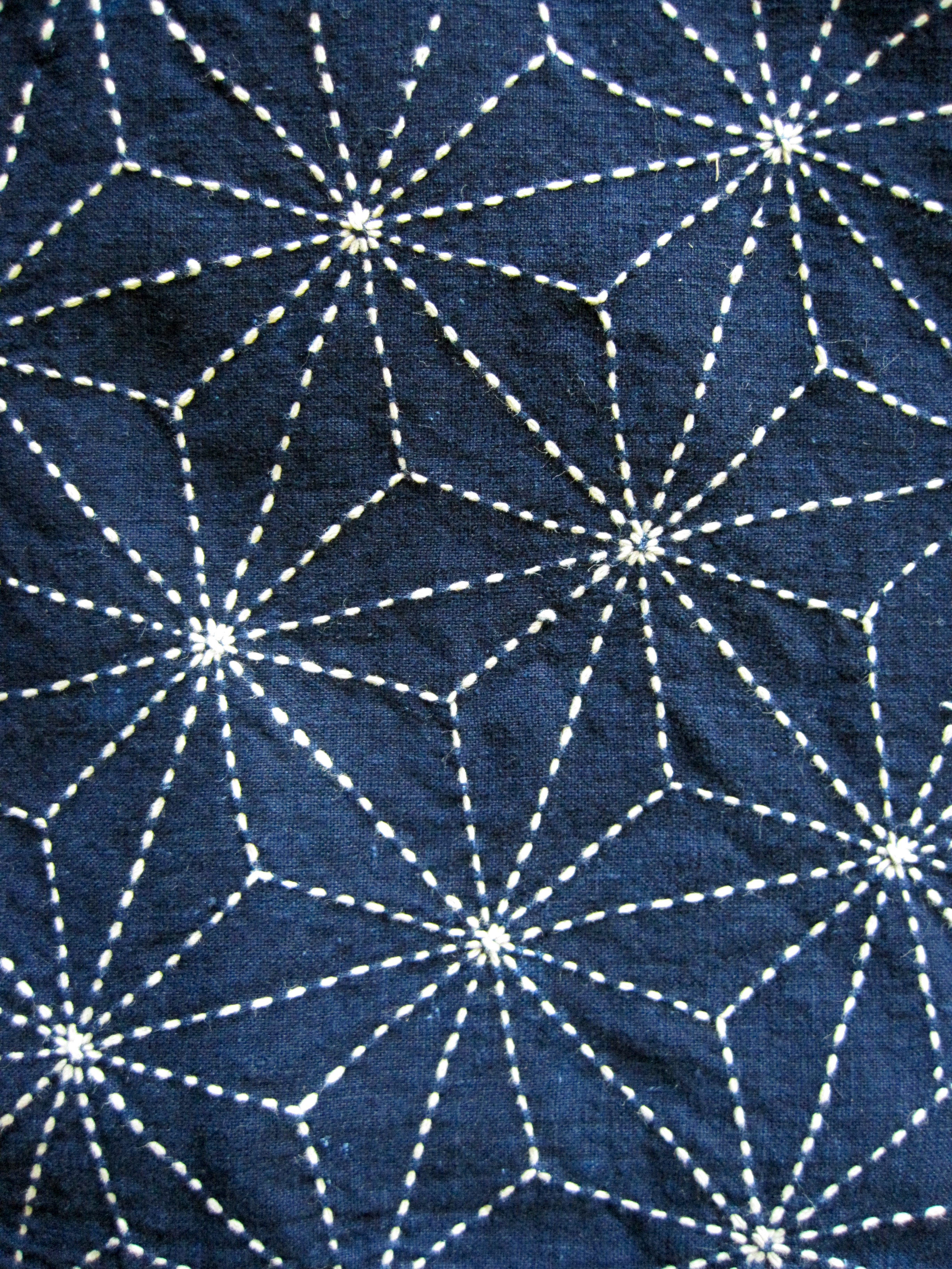 Sashiko is a form of traditional Japanese embroidery originally used to reinforce garments and as a means of repair. In the northern regions of Japan garments were made stronger and warmer by layering cloth and stitching the layers together with long running stitches. This embroidery served a utilitarian purpose but also became a way to add decorative patterns and interest to garments and carrying cloths.
